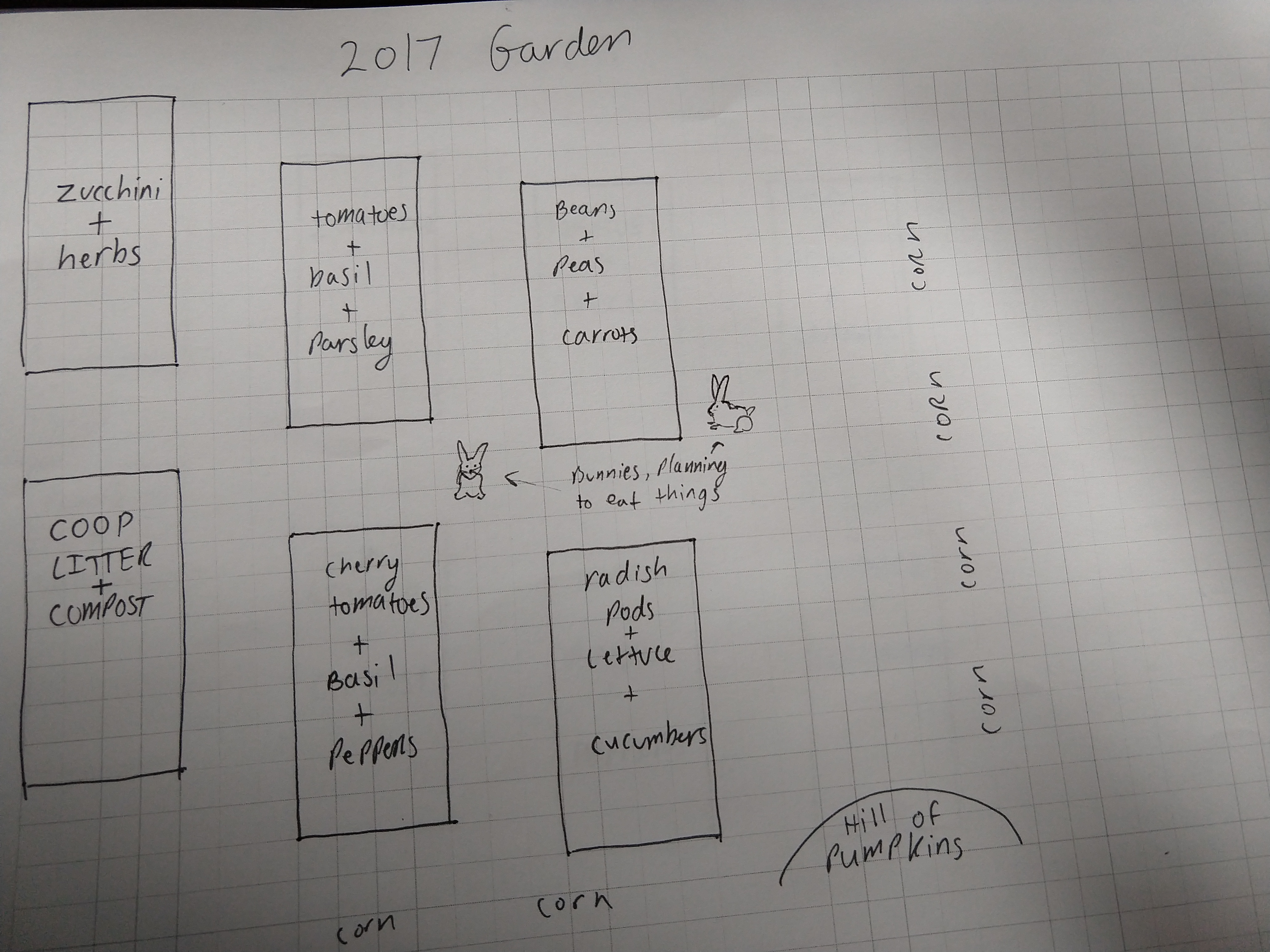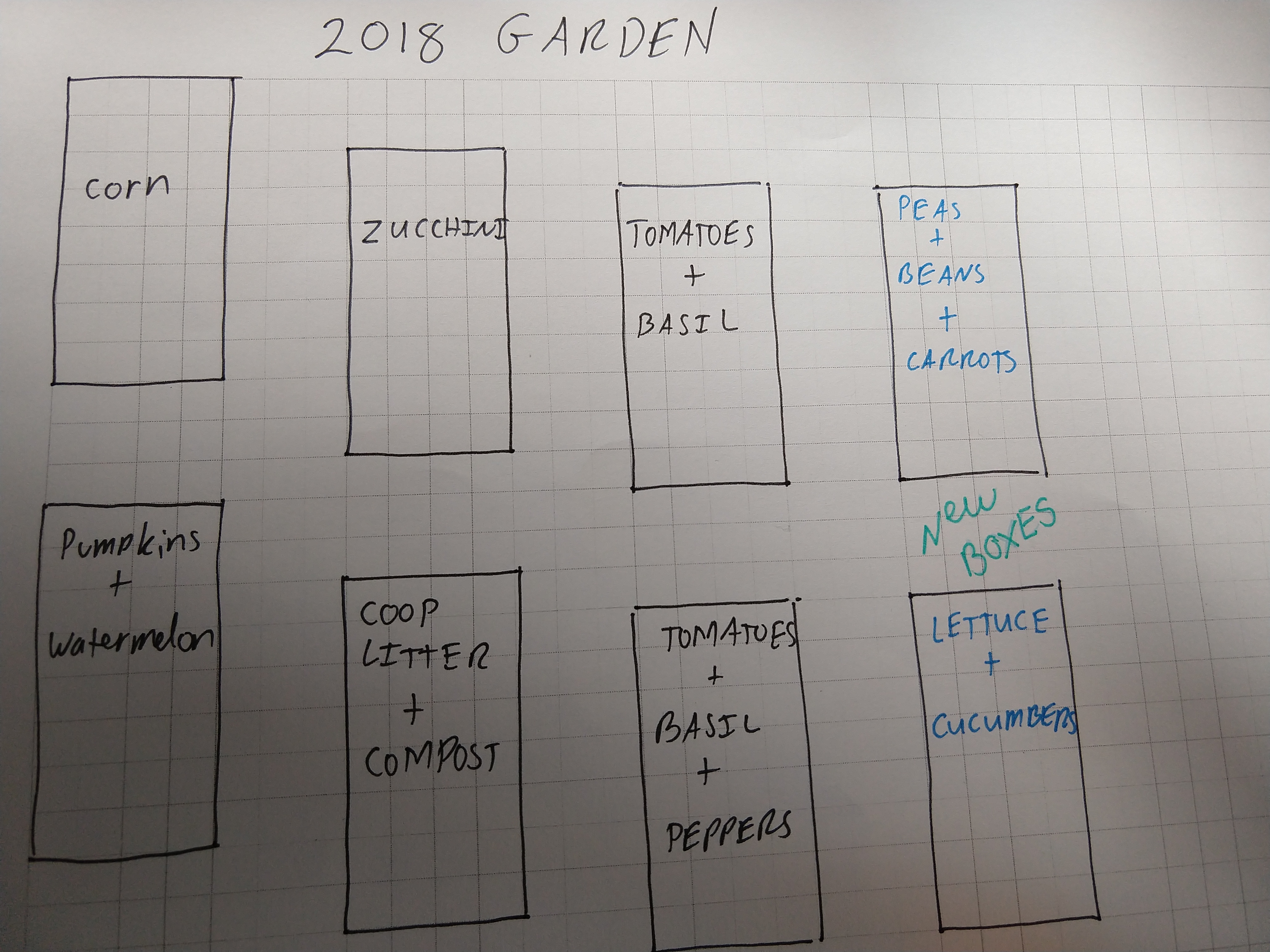 Two things that need to happen in 2018. First we need to rotate all our crops to prevent depleting the soil.  Second we need to remove the rabbits that are eating all the plants. Here is my proposed 2018 plot for the raised beds.