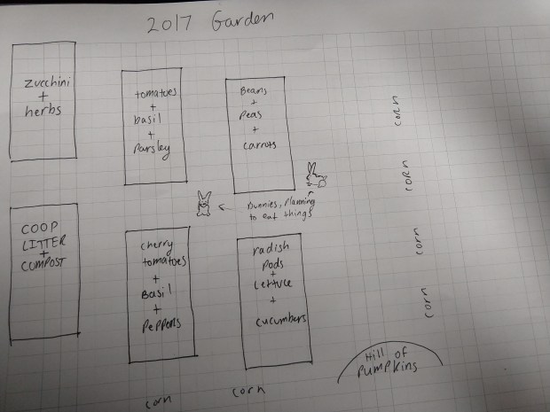 We have planned two more raised beds to make sure we have space for the pumpkins, watermelons, and corn. At this time am not certain how we will keep the bunnies away. It will probably involve a combination of strategic chicken wire placement and one of those spray on repellents you can make at home for pennies. I will also take rabbit-repelling suggestions from my fellow DIYeters.