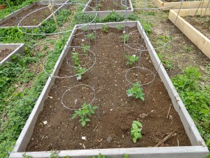 The hard part at this stage of the game, however, is to remove or re-locate the volunteer ‘maters without displacing the things I planted on purpose. Since most everything I planted is still in sprout form this meant some low speed hand plucking of the extra plants. Labor intensive? Yes. Tough on the knees and back? Yes. However, the only way to remove the tomato while preserving the carrot was with a very careful pinch. I repeated this procedure about a zillion times, sparing my little carrot sprouts, and my lettuce seedlings in the next raised bed.