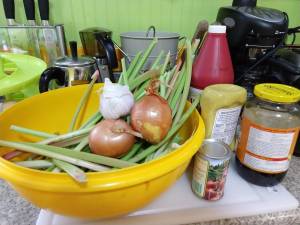 Besides rhubarb, most of the recipes I found on the internet used pantry staples like vinegar, sugar, and cayenne pepper. I poked around my pantry, and grabbed two onions, a few garlic cloves, tomato paste, molasses, liquid smoke, hot sauce, and brown mustard.