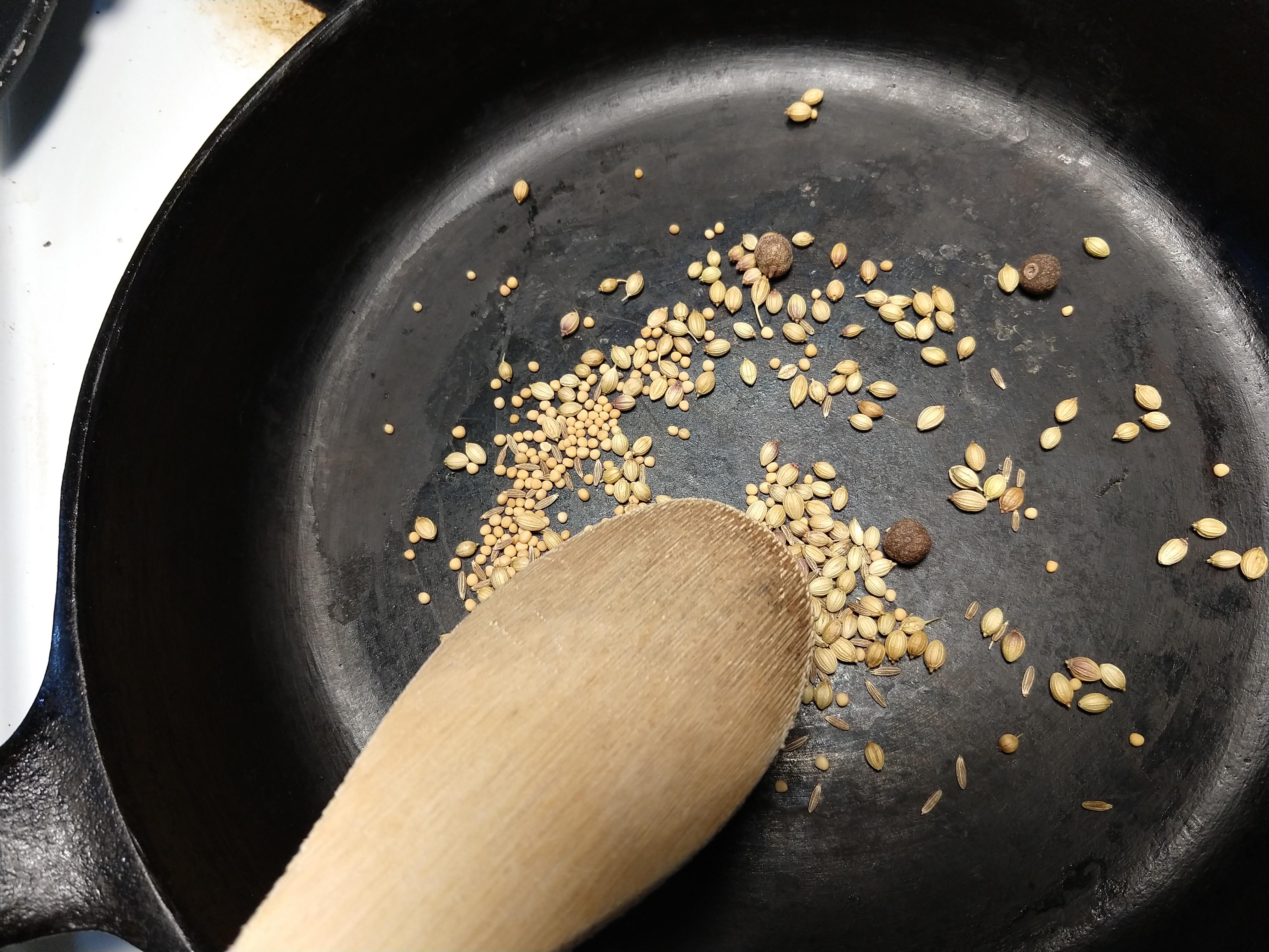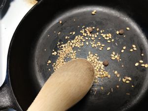I chopped the rhubarb stems and added them to the pot. I also added a pinch of salt to help draw out the water as it all cooked down. While that was happening, I selected my spices and toasted them. I went with cumin seed, coriander seed, mustard seed, and a few allspice berries.