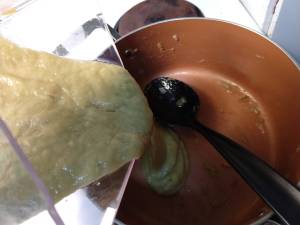 Once the seeds got nice and toasted I let them cool then smashed them. I also let the softened onion/garlic/rhubarb mix cool before I moved it from the pan to the blender. Do not put really hot food in your blender.
