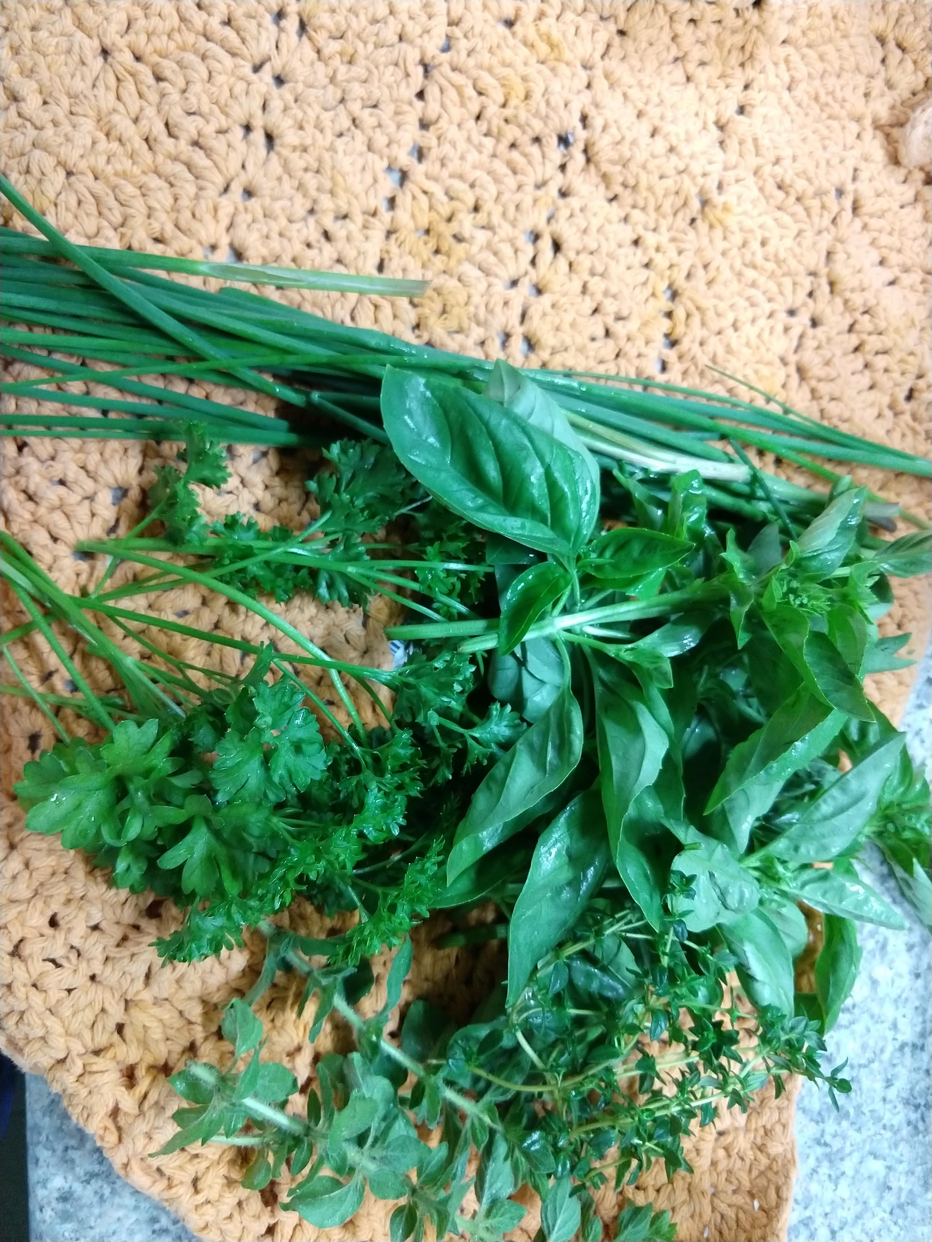 First I cut a little each of basil, chive, thyme, parsley, and oregano. I left out the sage and rosemary because I do not really like how they taste raw. I also left out the cilantro because many people do not like the taste of it at all. The next step, obviously, was to wash all the herbs I had cut.