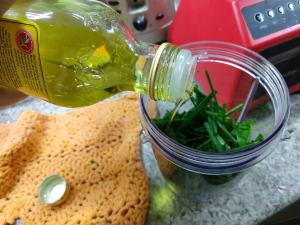 Based on the amount of prepared leaves I selected our mini blender for the pulverization step. I added a splash of lemon juice (yup, the bottled stuff), and a drizzle of olive oil. I totally eyeballed it, but the liquid came about a quarter as high as the herbs.