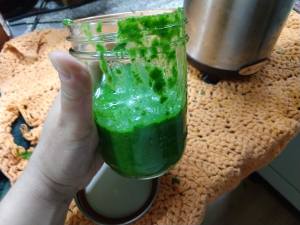 Just a minute or so of blending and look at that green beauty! If you have never cooked with fresh herbs you really need to try it. The smell is amazing. I transferred the pesto to a jar and set it in the refrigerator.
