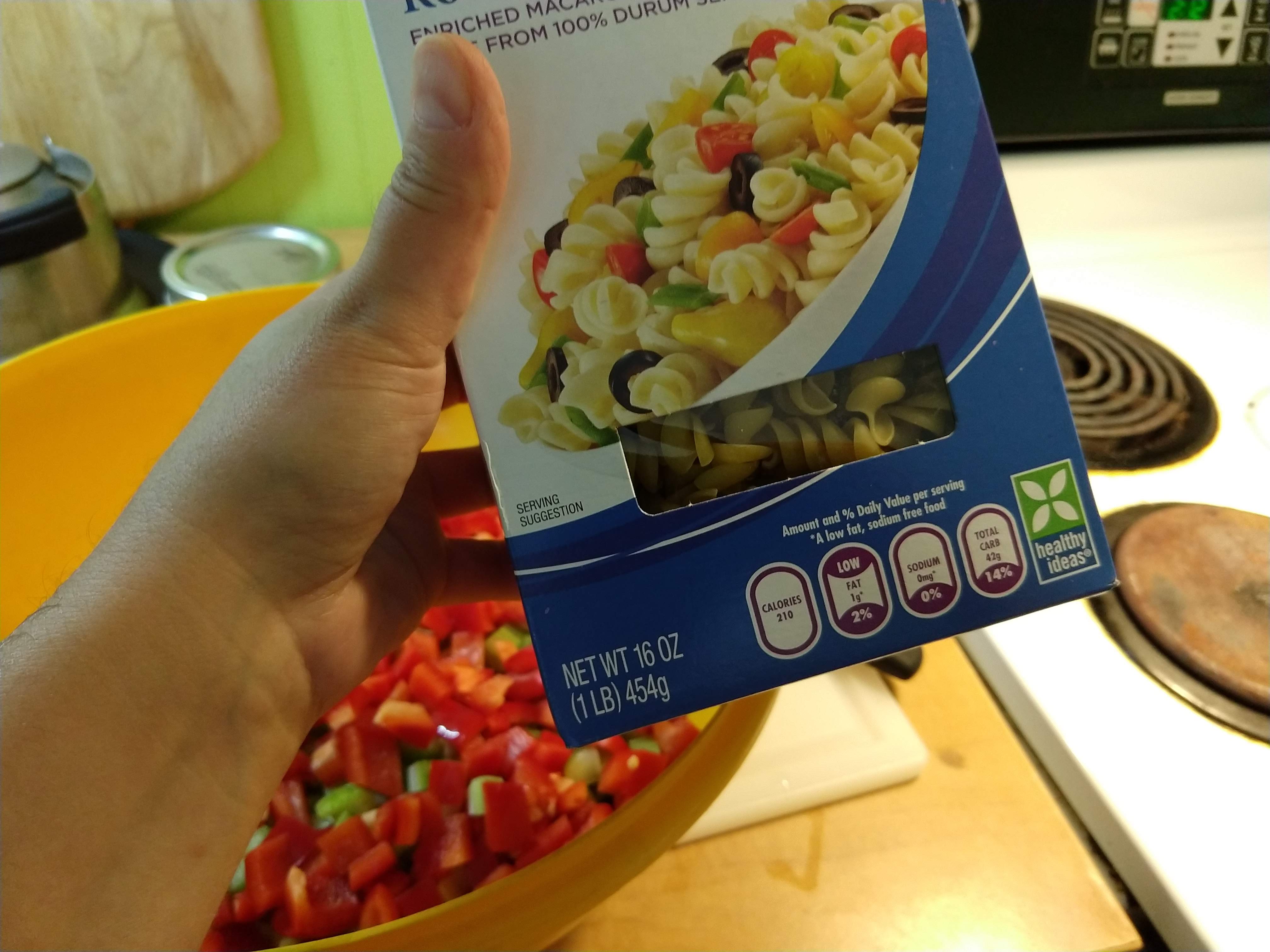 Saturday afternoon I boiled a pound of pasta. Another top tip: read your boxes. Some companies are puting less than 16 oz. of pasta in each box. I found a box that is still one whole pound, and it was the store brand so it cost $1. Win and win. In the background you can see the four ribs of celery, two red bell peppers, and the English cucumber I diced.