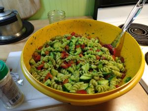 With the pasta cooked and drained I combined everything in my biggest bowl. I used the entire batch of pesto and it was the right amount. I added a judicious sprinkle of grated Parmesan cheese and checked the taste. It was just salty enough. Many pasta salad recipes call for running cold water over the cooked pasta before combining. However, hot pasta will absorb the pesto flavor better.
