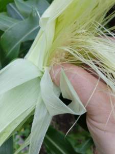 Ripe ears of corn have dry looking, black or brown silk and feel firm and full when you give them a squeeze. Not sure your ears are really ripe? Here is a rule of thumb I learned from the Old Farmer’s Almanac. (So you know it is trustworthy advice.) Carefully peel back the husk and smoosh a kernel with your thumbnail. If the juice looks like water close the husks back up and let it ripen some more. If the juice looks like milk you are ready to harvest. This ear was ready to go!