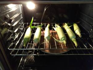 Boiling ears is fine, but Mr. Food It Yourself and I like them roasted. Take off just the outer layers of husk. Place the ears on the rack of a 350F oven and let them go for about 30 minutes.