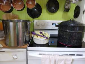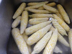 Step 3: Blanch the corn. When you harvest fruits and vegetables they are still biochemically active. I know, that is a little creepy to think about. The sugar in corn starts turning into starch through the action of enzymes. To keep the sweetness we need to deactivate the enzymes with a quick burst of heat and then a fast cool down. The kettle on the right is full of boiling water, the kettle on the left is full of ice water. Boil ears for 4-8 minutes (the thicker the cob the longer the boil) then move right to the chiller. You want them in the ice water for the same length of time you had them in the boiling water.