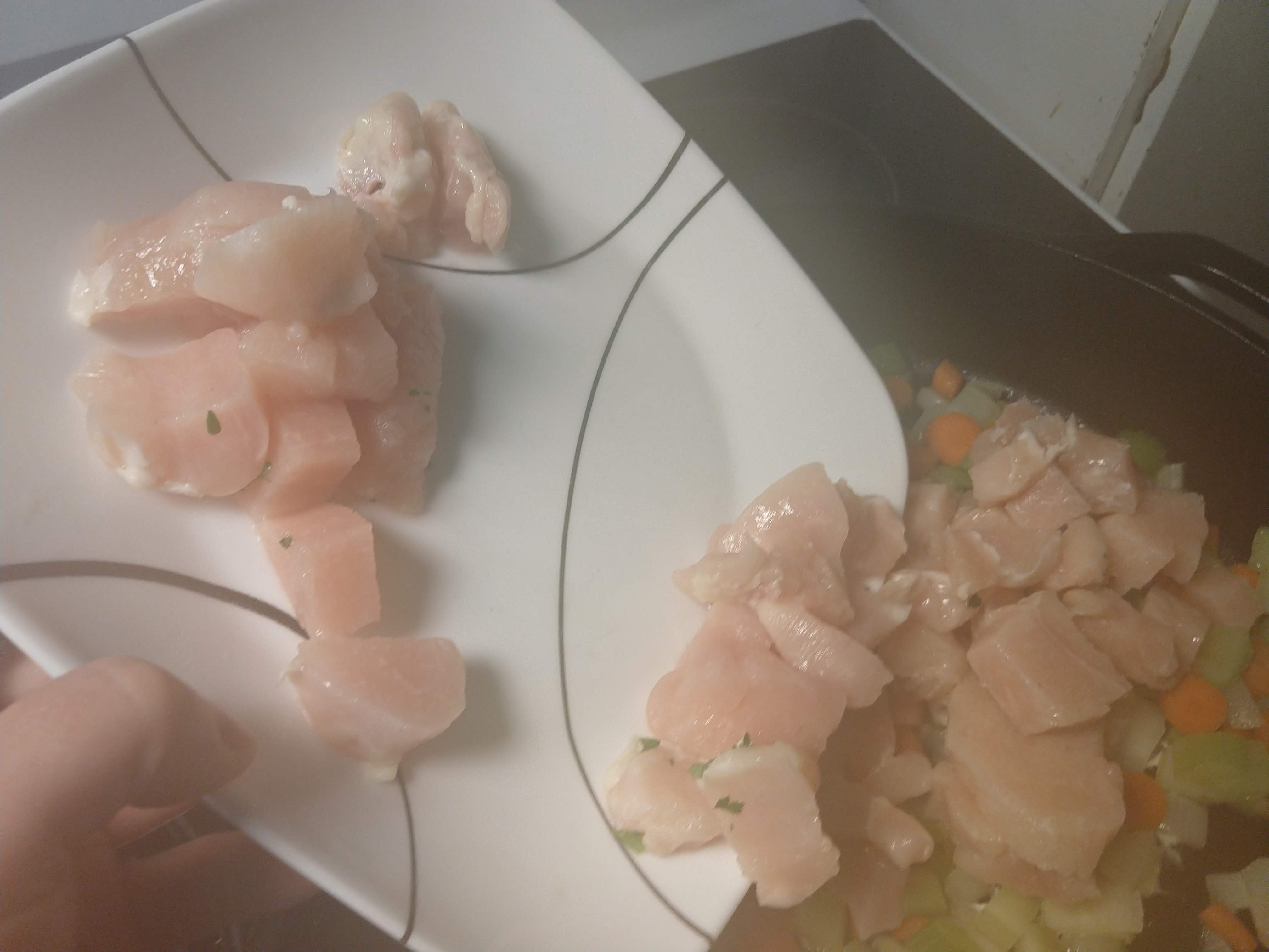 Also while this was happening I was using my microwave to partly thaw a couple of individually quick frozen (“IQF” in food marketing lingo) boneless chicken breasts. Once they were defrosted enough to get a knife through, I diced them. You can use turkey, if that’s what you have. Even tofu would work. This is your dinner, do your thing.
