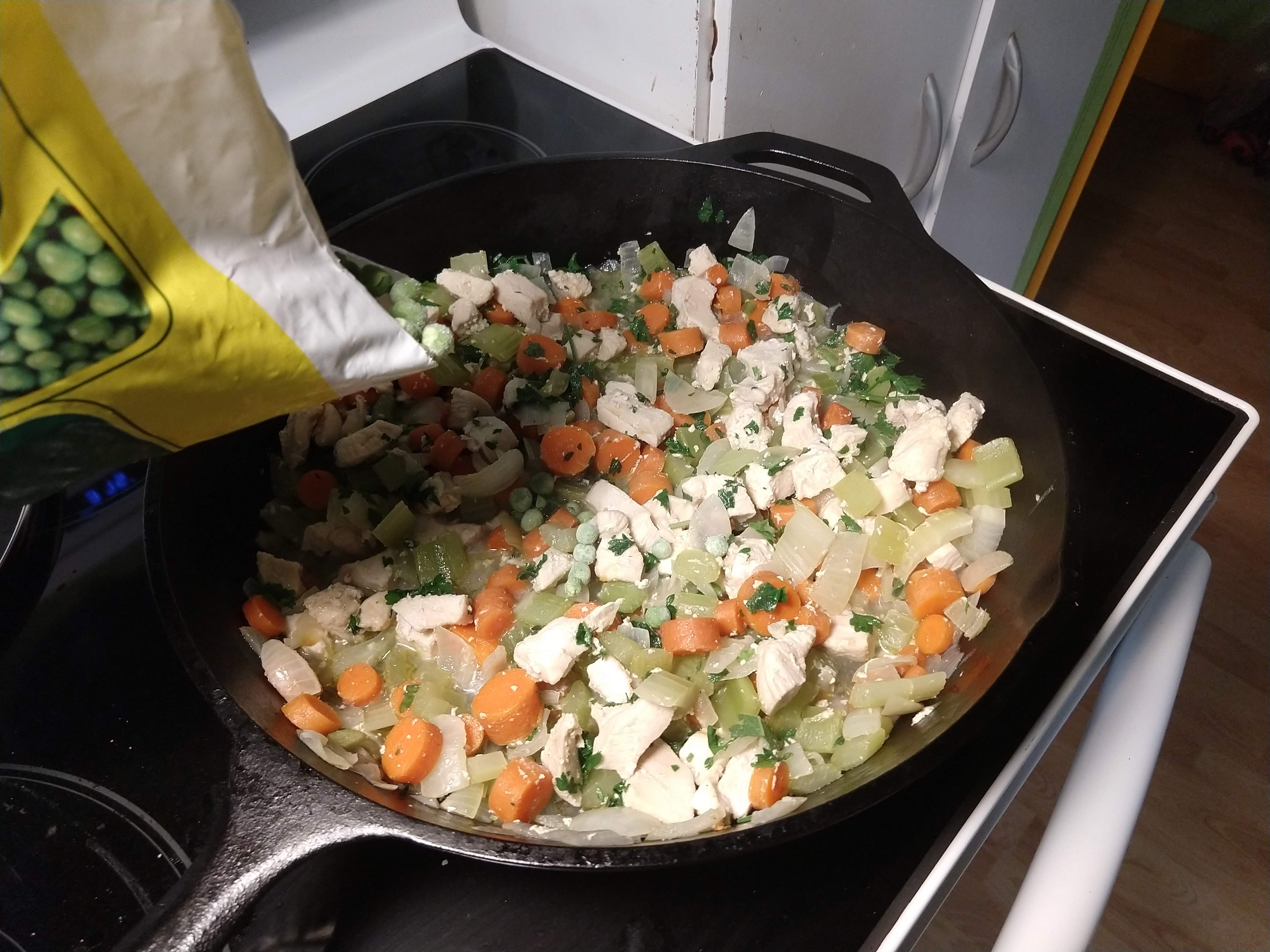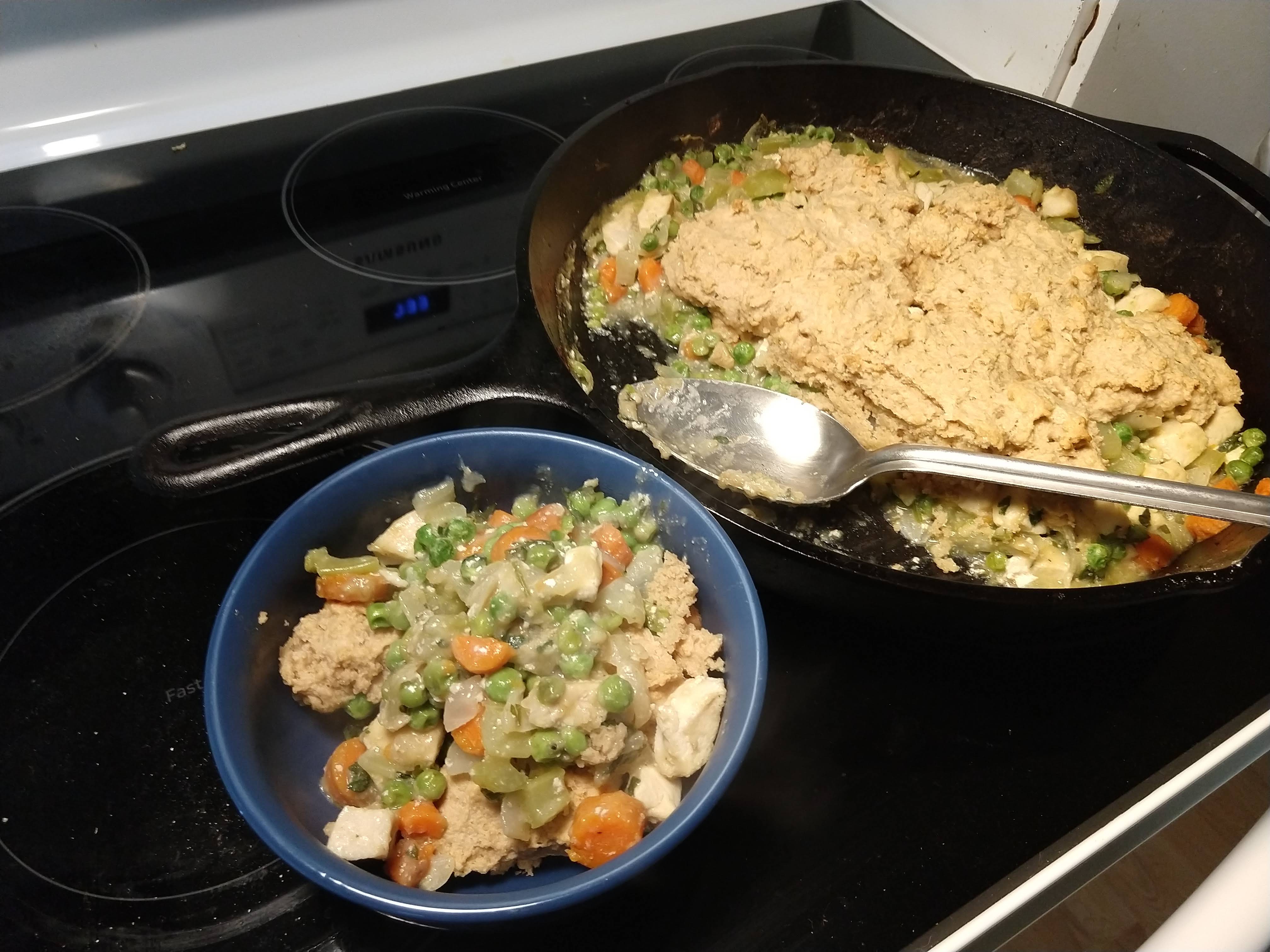 If I have frozen peas, I’ll add them now. They just need to thaw out; overcooked peas are gross. I eyeballed a generous cupfull. I added about 1/4 cup broth with a tablespoon or so of flour mixed in to thicken the juices. I let that come to a boil so the flour started the thickening process. Finally, I mixed the wet and dry biscuit ingredients together, plopped the sticky dough on top of the filling, and placed the heaping skillet in the oven for 20-25 minutes, or until the topping was cooked.