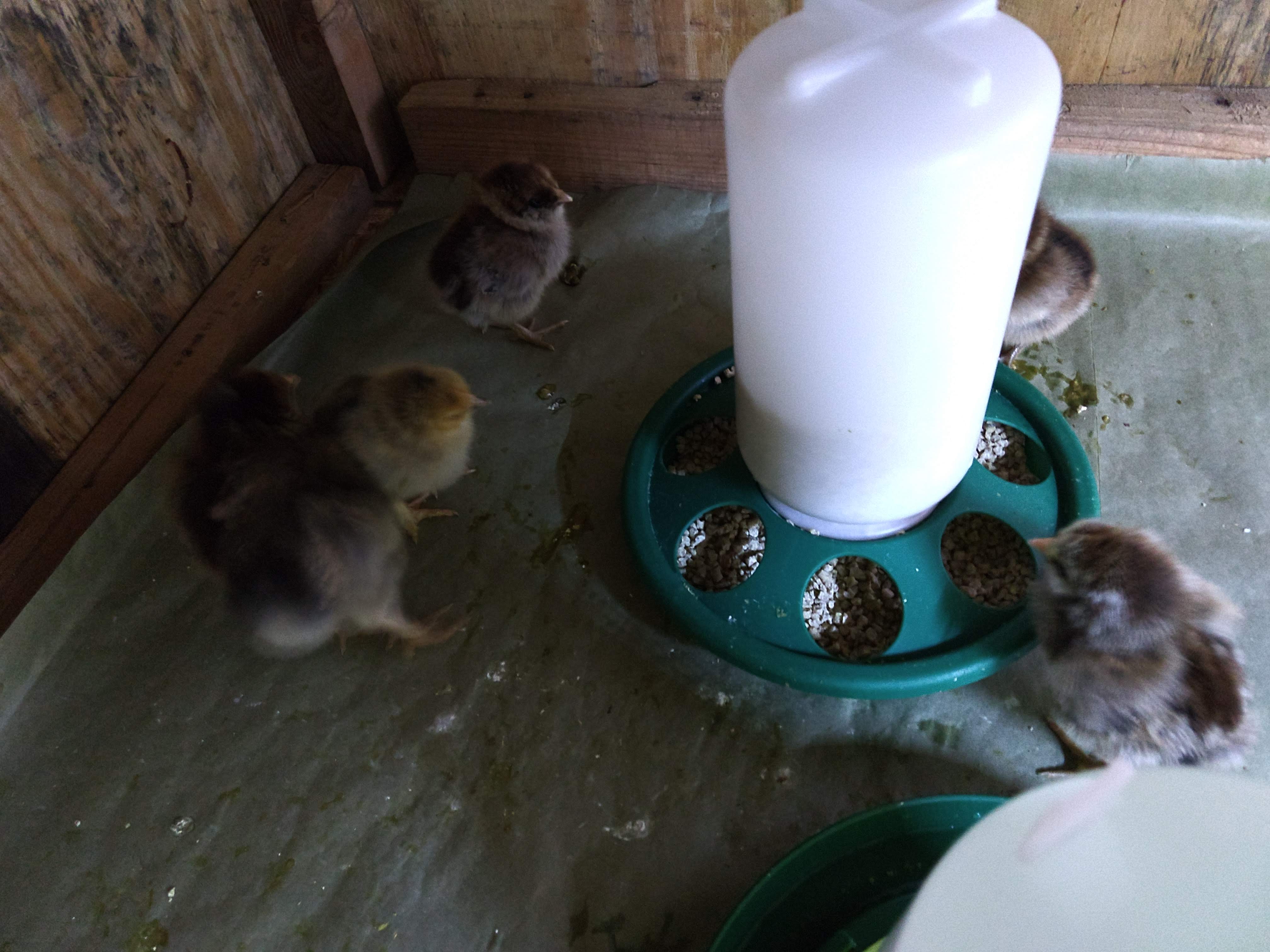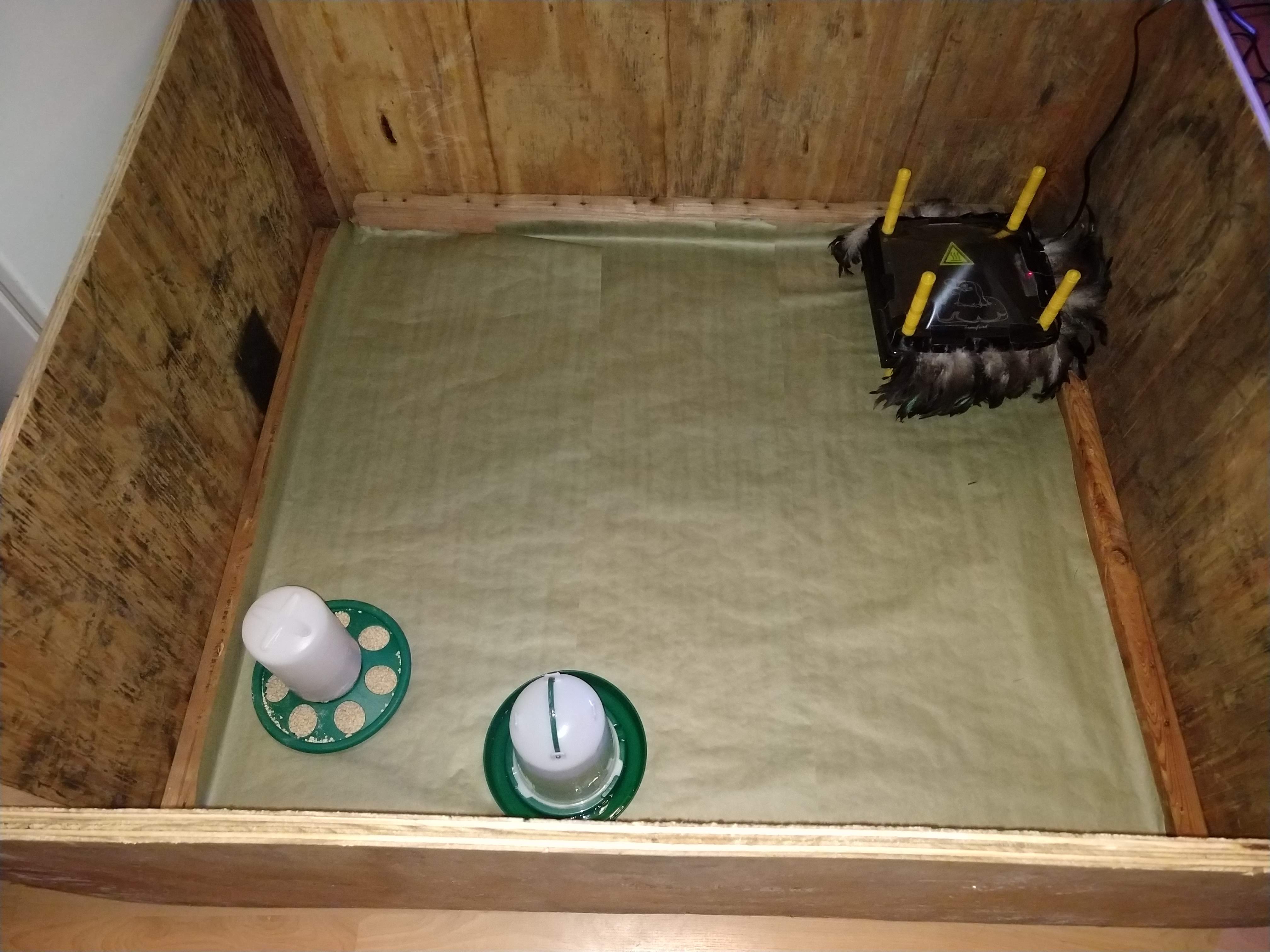 As you can see, the brood box is quite spacious. In the lower left corner are the food and water dispensers. In the upper right corner is the “false hen”. It is a special heater designed specifically for keeping baby fowl toasty, but not too toasty. (The feather skirt is optional, but awesome.) Again, there are plenty of options when it comes to heaters for a brood box. This is definitely not an item you want to DIY, however. SERIOUSLY, NEVER USE A HEAT-PRODUCING DEVICE FOR A PURPOSE OTHER THAN THE ONE FOR WHICH IS WAS DESIGNED. You could harm your brood. Or start a fire. Don’t be stupid. Spend a few bucks and get something safe.