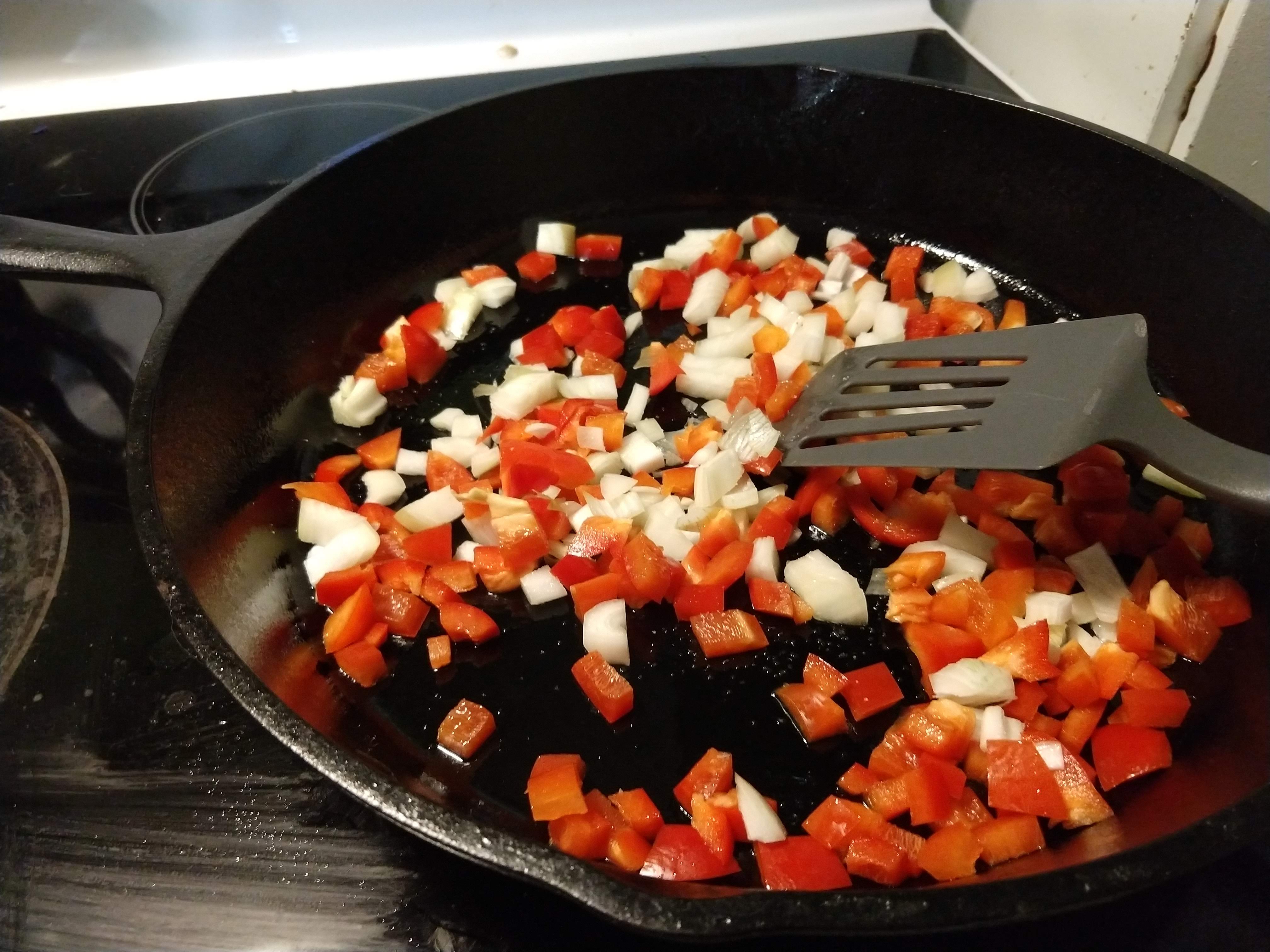 Step one- Heat your favorite frying pan over medium-high heat and add a mist of oil spray. Saute a medium onion diced, as much garlic as you like (or leave it out if you don’t like it), and a sweet pepper until the onion goes translucent.