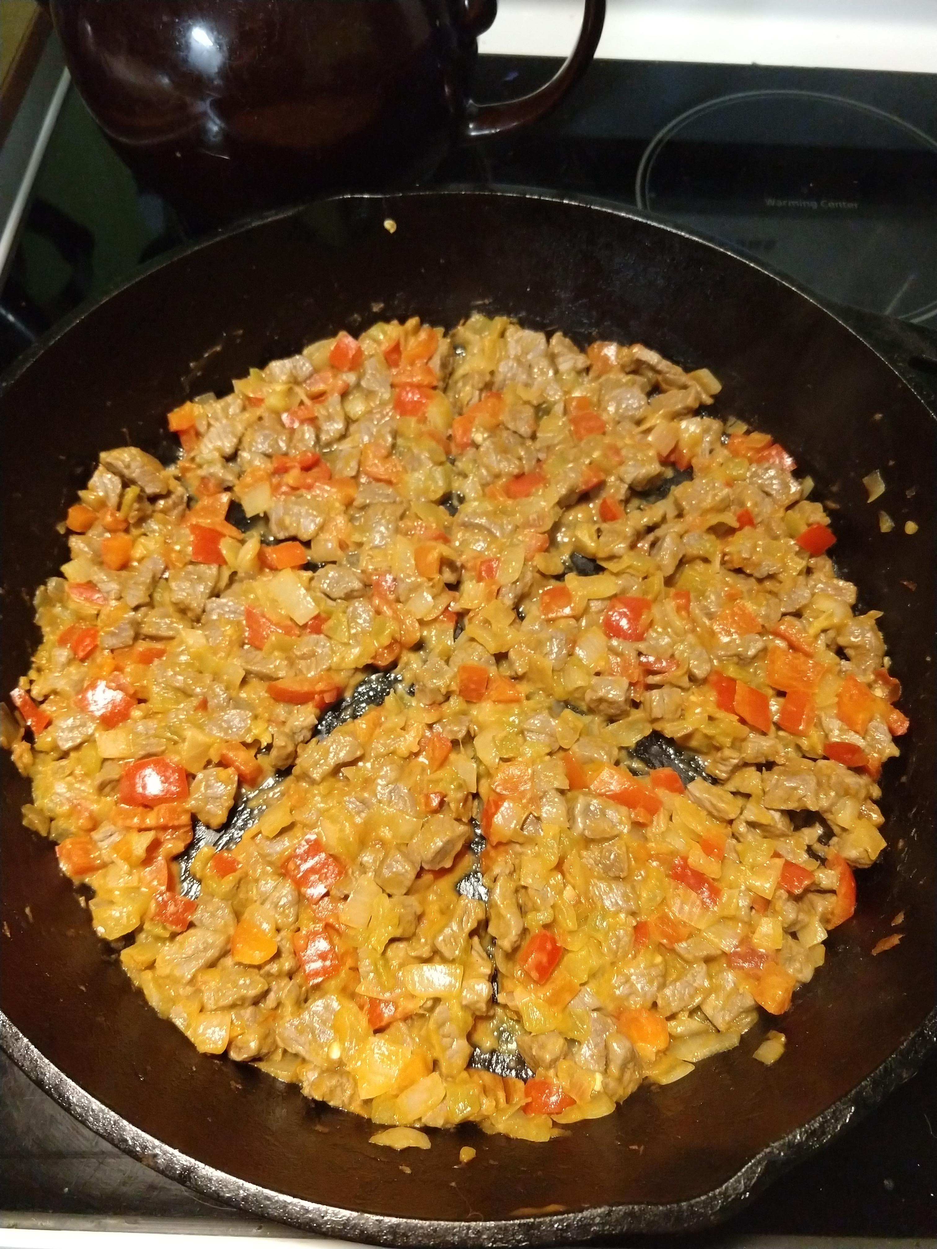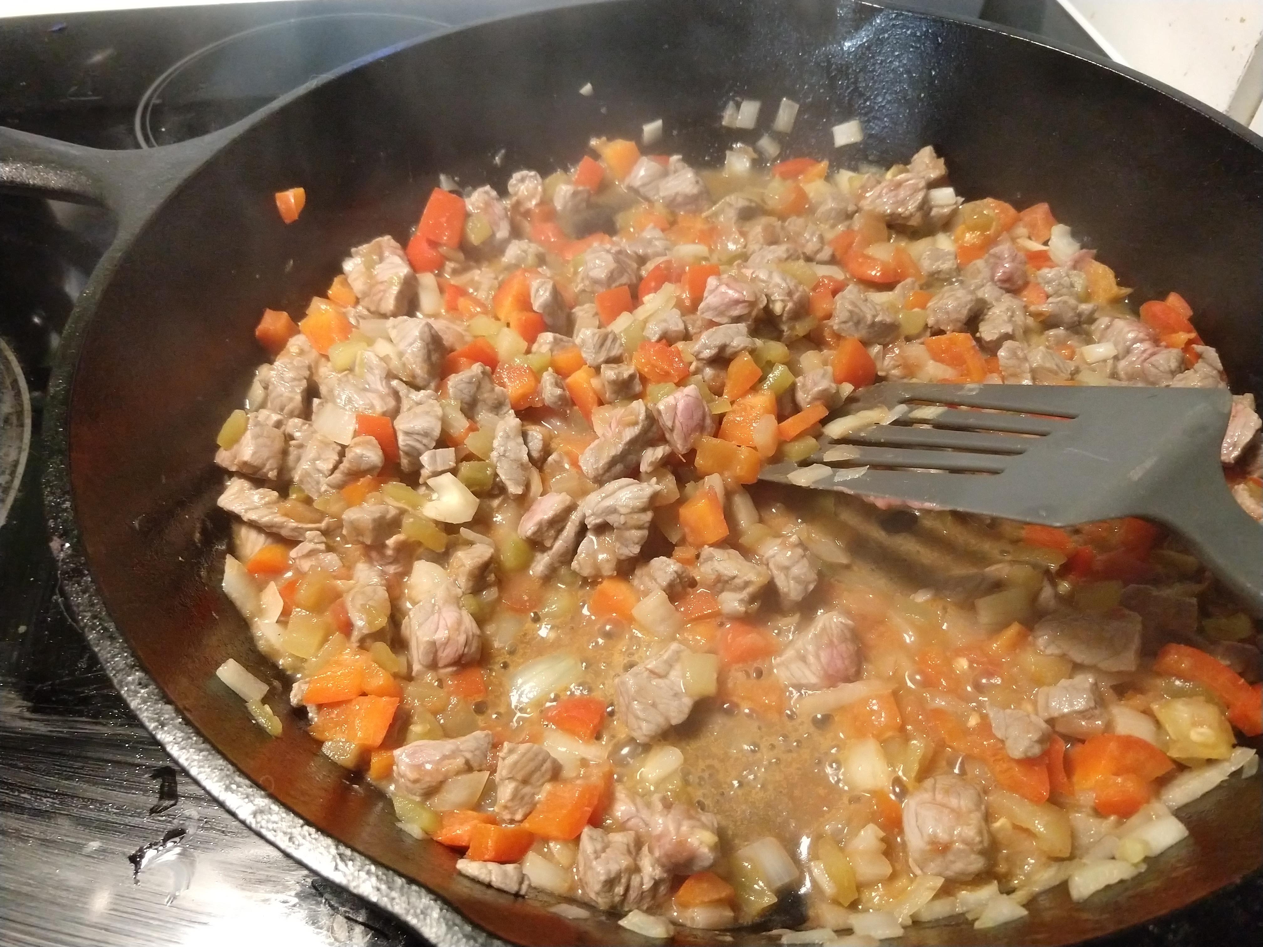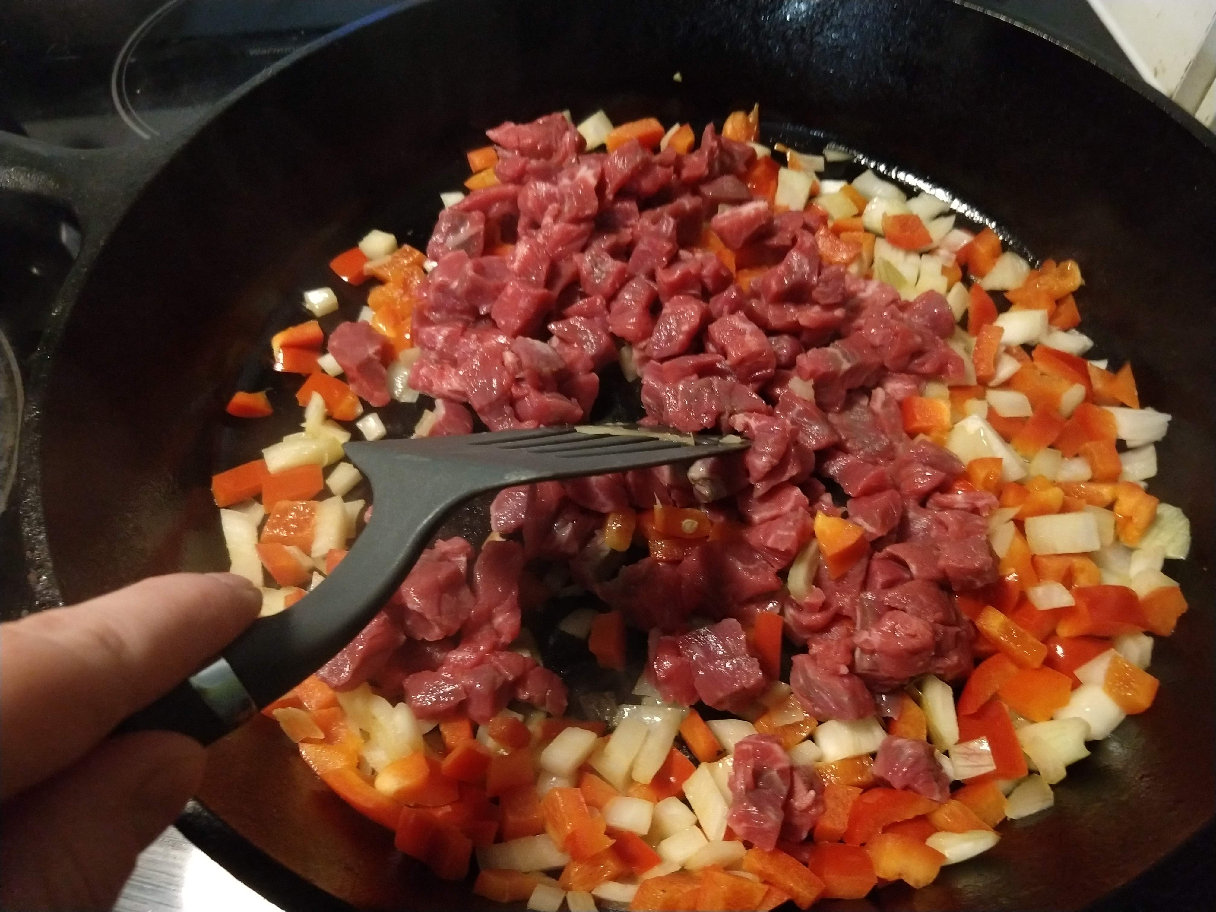 Step two- Add the meat. I use whatever lean stuff the grocery store has a deal on. Sometimes they have 93% lean previously frozen ground beef on special, sometimes they have a good price on ground turkey. This week, they had some really lean looking “stir-fry beef” at a good price. I am 100% certain it is the little odds and ends they are left with after cutting the larger steaks and roasts. I am okay with that. I diced it small and cooked it most of the way through.