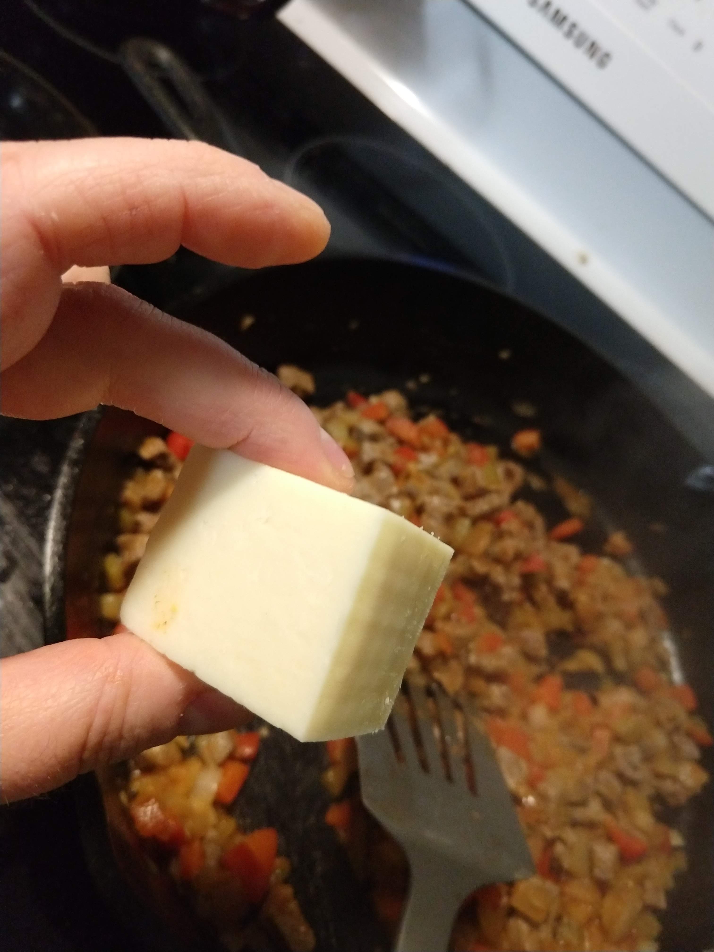 Step four- Turn off the burner and add 2-3 oz of really good, really sharp cheddar; sliced or shredded. You could substitute another strong flavored cheese of your choice. Keep stirring with the residual heat to get the cheese to melt. That is the glue that will keep your chimichangas together. Fellow DIYeters with special diet needs, take note: cheese is high in saturated fat, calories, and most damningly of all sodium. Use the good stuff and use it wisely.