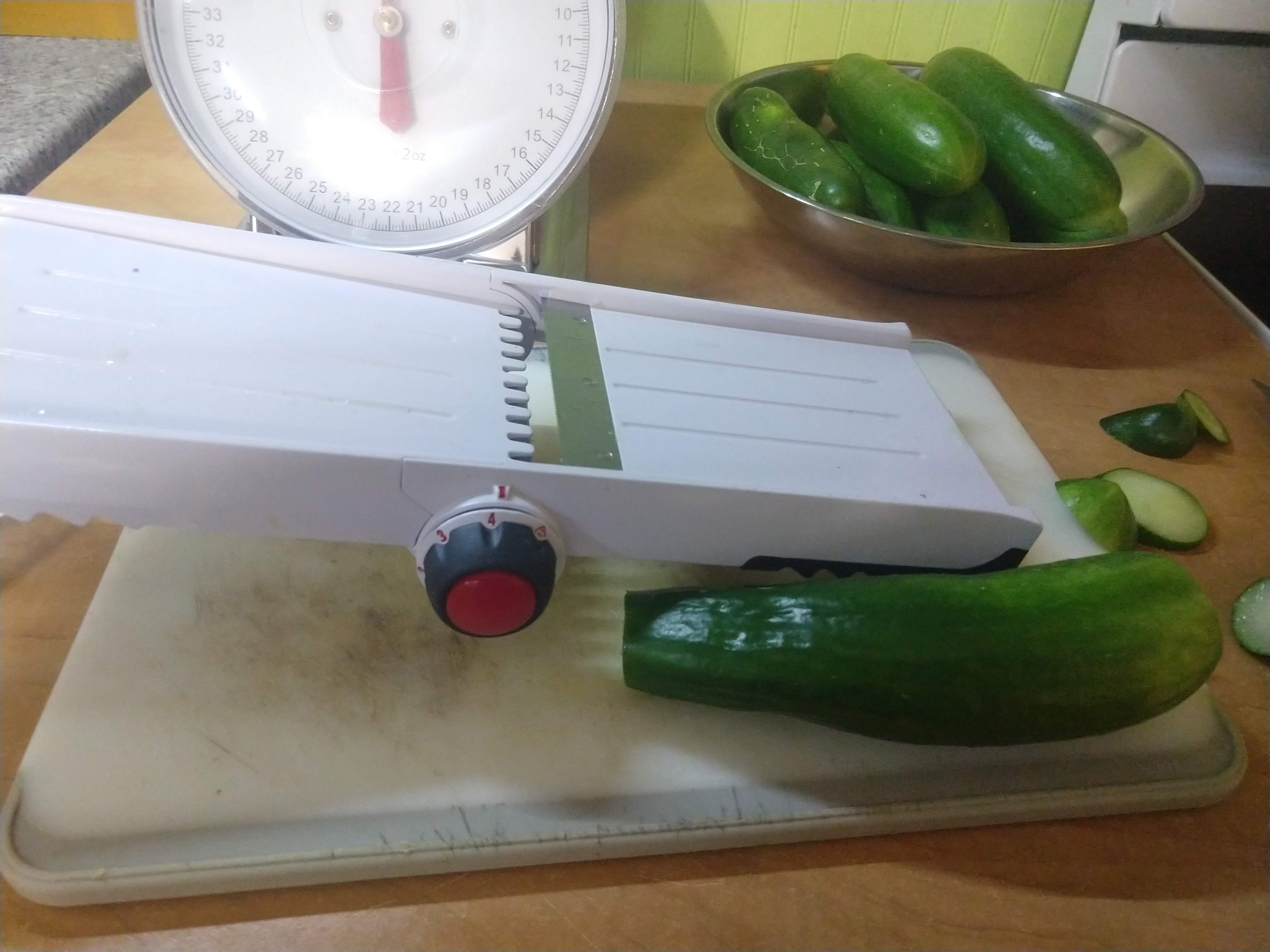 First, the cucumbers need picking and then a thorough but gentle scrub. My slicing skills are less than stellar, so I busted out the mandolin to ensure evenly thick cucumbers and onions. Bonus, this little gizmo makes the slicing go super fast.