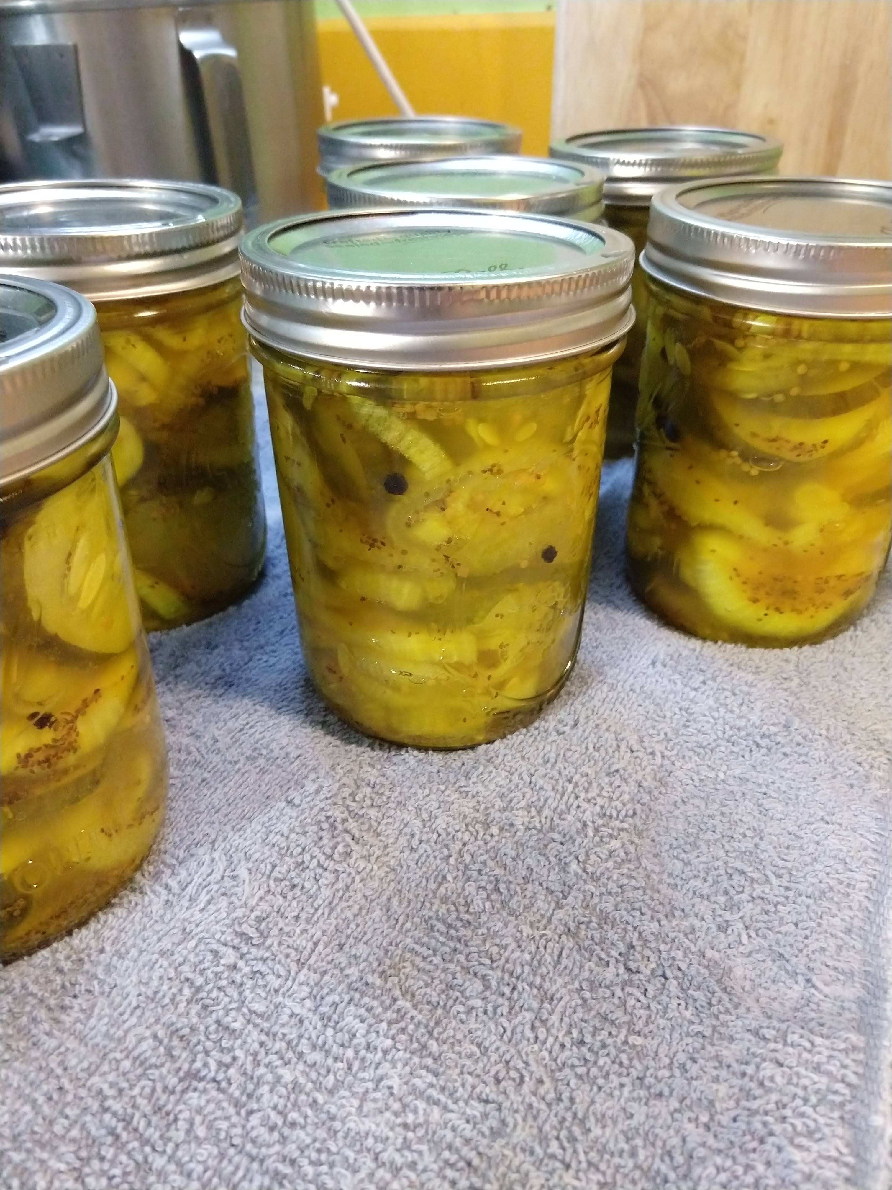 Today, I harvested an additional 4 pounds of cukes. Thankfully, I was totally prepared for the occasion. I had the tools, the spices, and the vinegar all ready to go. With them I was able to put up seven beautiful pints of bread and butter pickles. Preserved pickles are not any harder to make than refrigerator pickles, but the preparation does take a bit more time. When you consider that a preserved pickle can last 18 months in storage, it is absolutely worth it, though. As with all long-term food preservation methods care must be taken to keep the pickles both safe and pleasant to eat. I took extra care to make sure my pickles would have maximum crunch; nobody wants a mushy pickle.