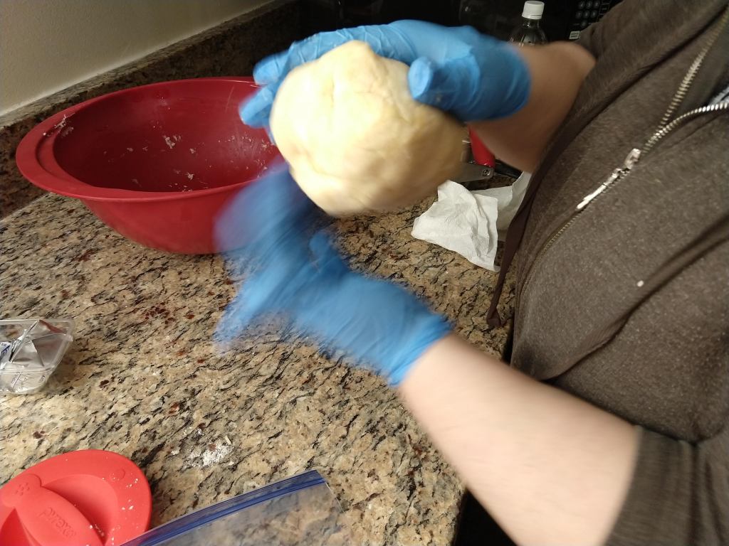 Then it was time for the ultimate challenge. Syllie volunteered to roll out the bottom crust. This is another danger zone for gluten production. Yes, if the dough sticks to the work bench or falls apart it can be re-rolled. However, every re-rolling creates more of that leathery gluten. Resting the dough between rolls only helps so much.