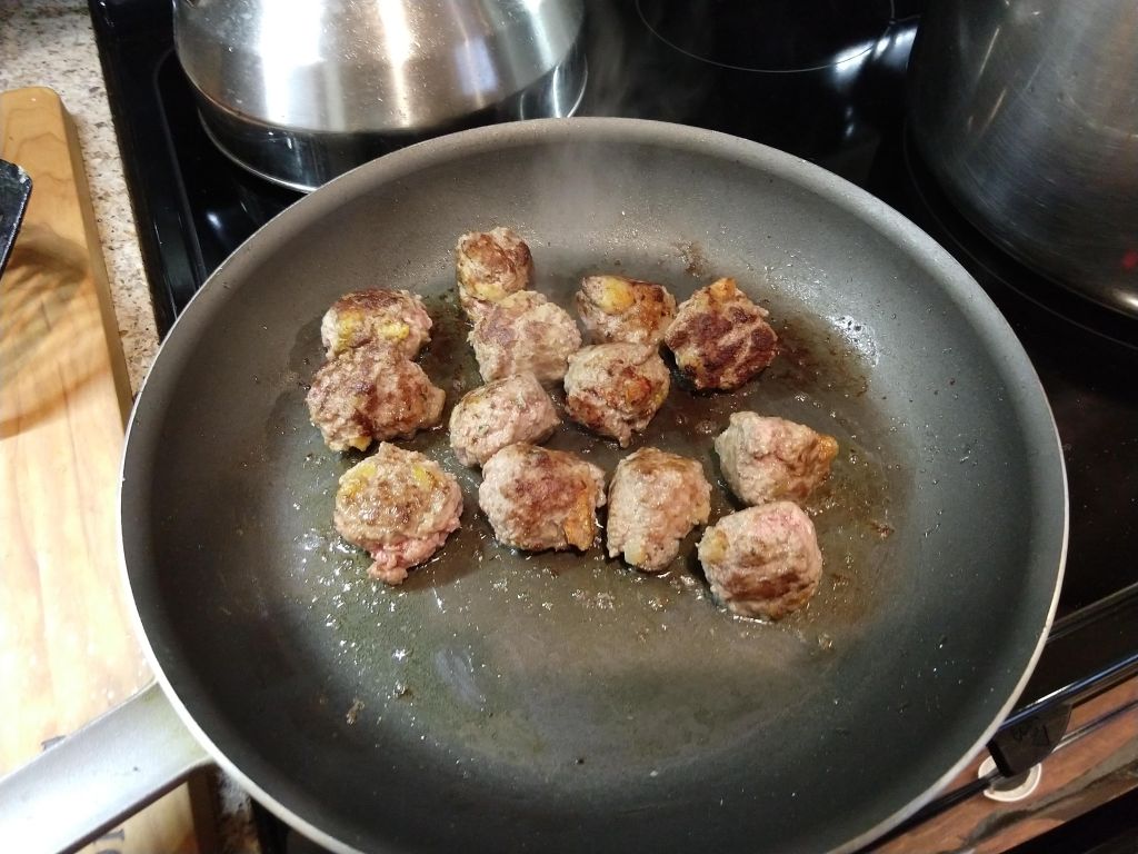 Dad used a scoop to make evenly sized meat balls and I seared them on all sides in a skillet.