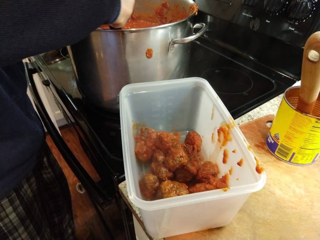 One pan of shortbread and four dozen snowballs later, (with a break for lunch) Dad sifted the meatballs out of the kettle. We set the sauce to cool a bit on the back porch. Both sauce and meatballs ultimately made it to the freezer. They will be thawed for our magical Christmas feast. It might be manicotti, it might be lasagna. I will let you all know. The important thing is that we made some delicious sauce.