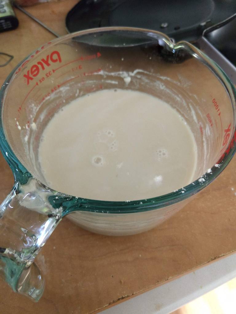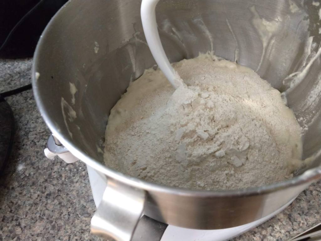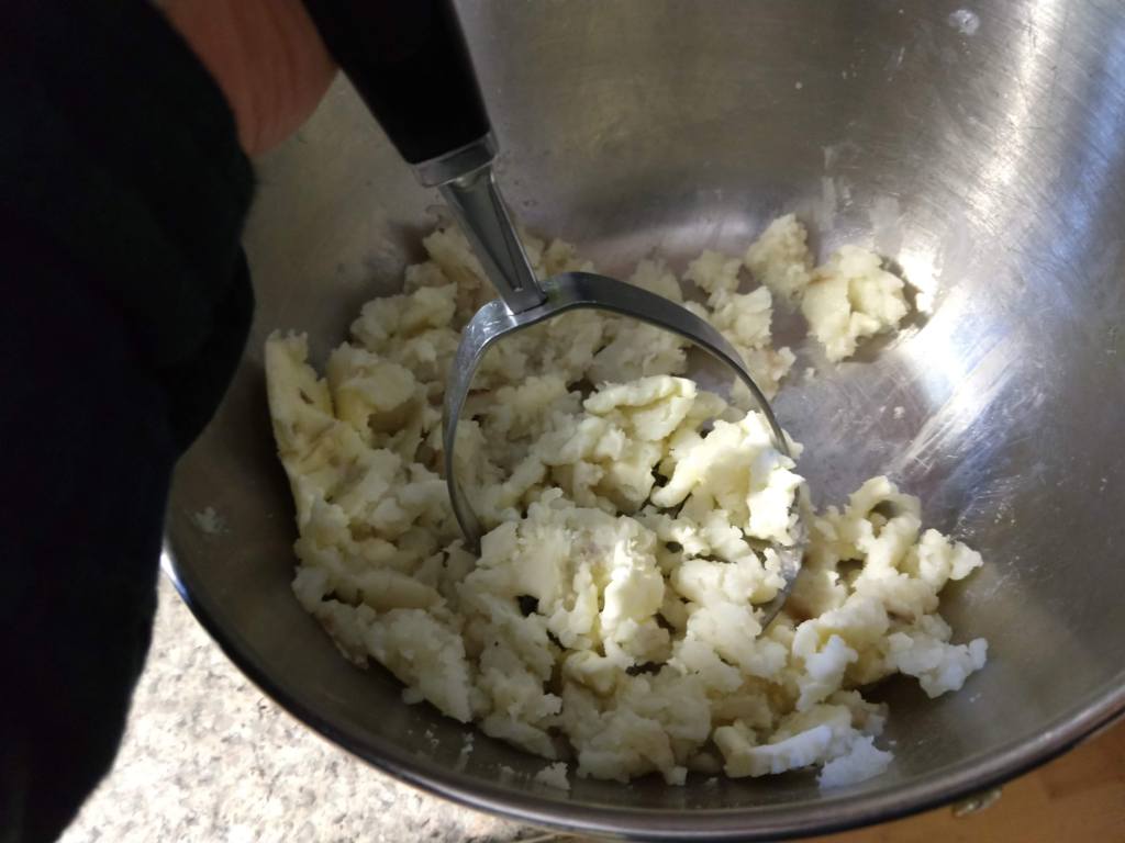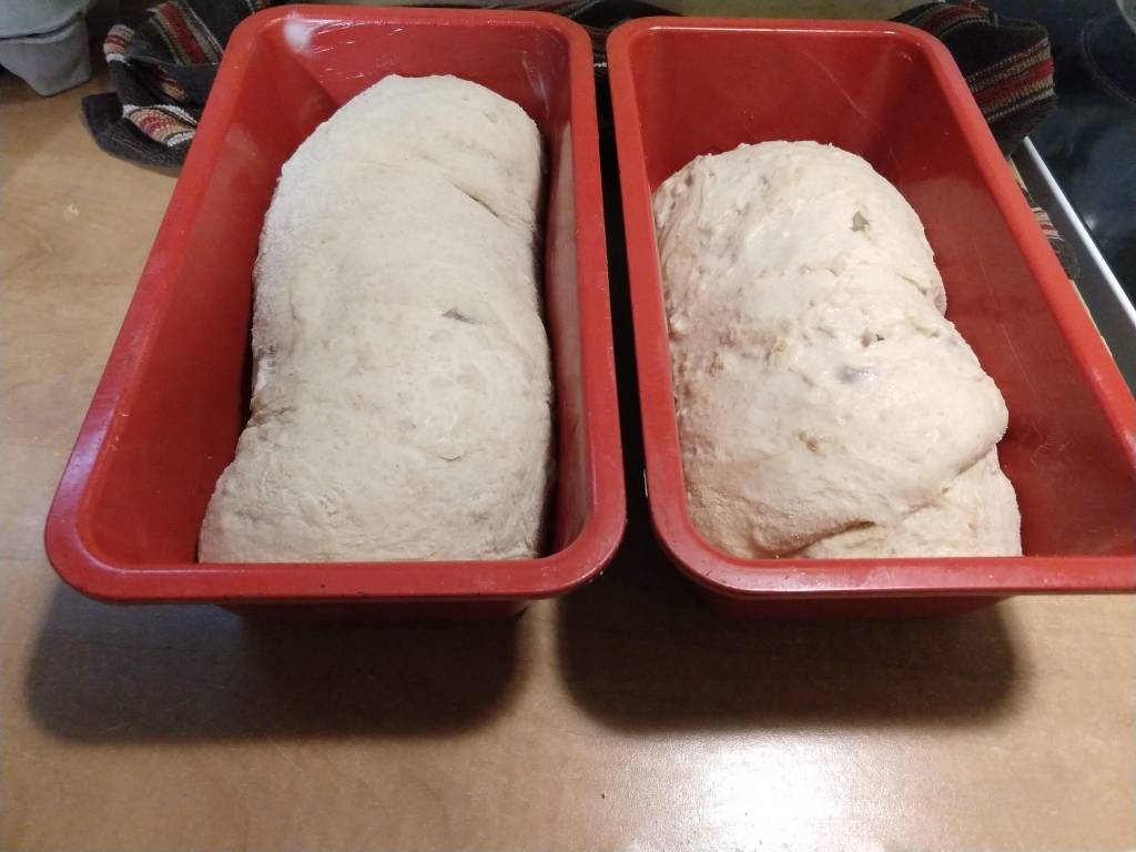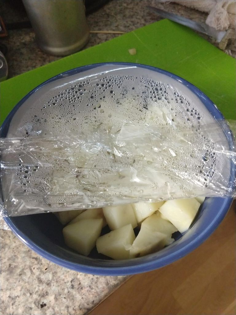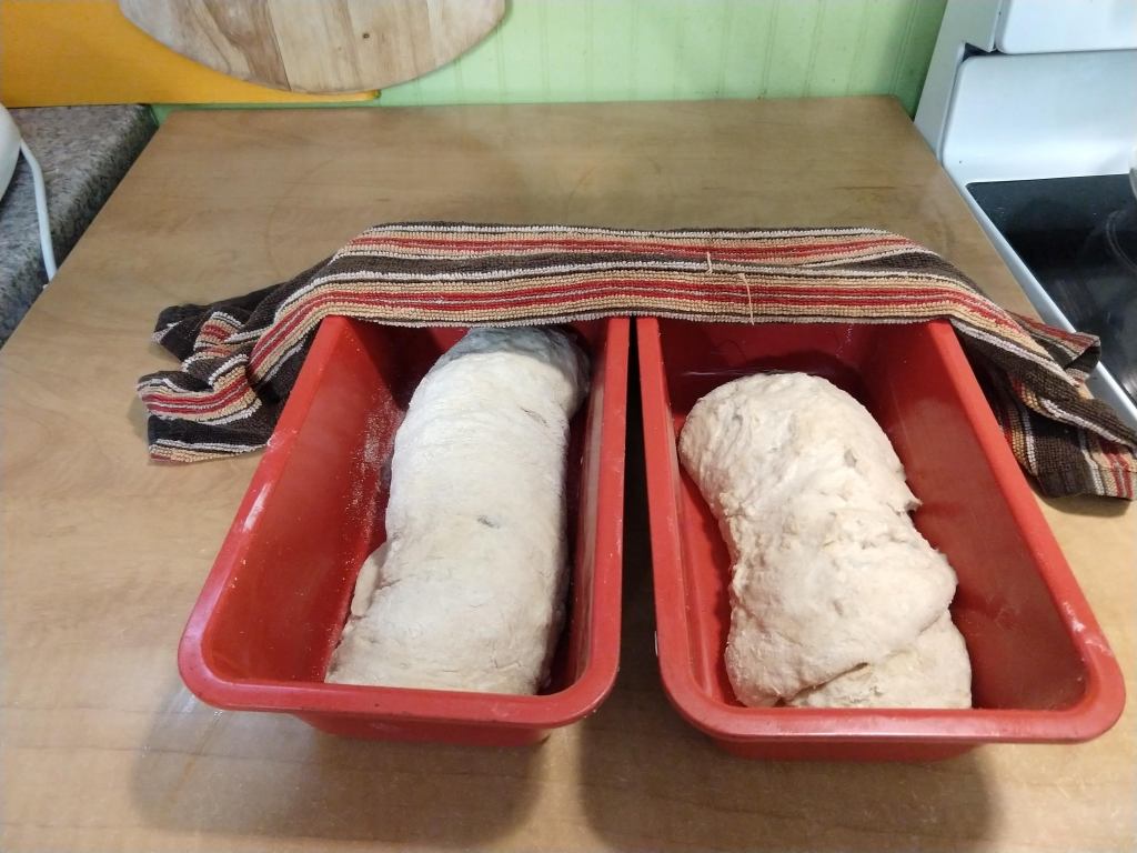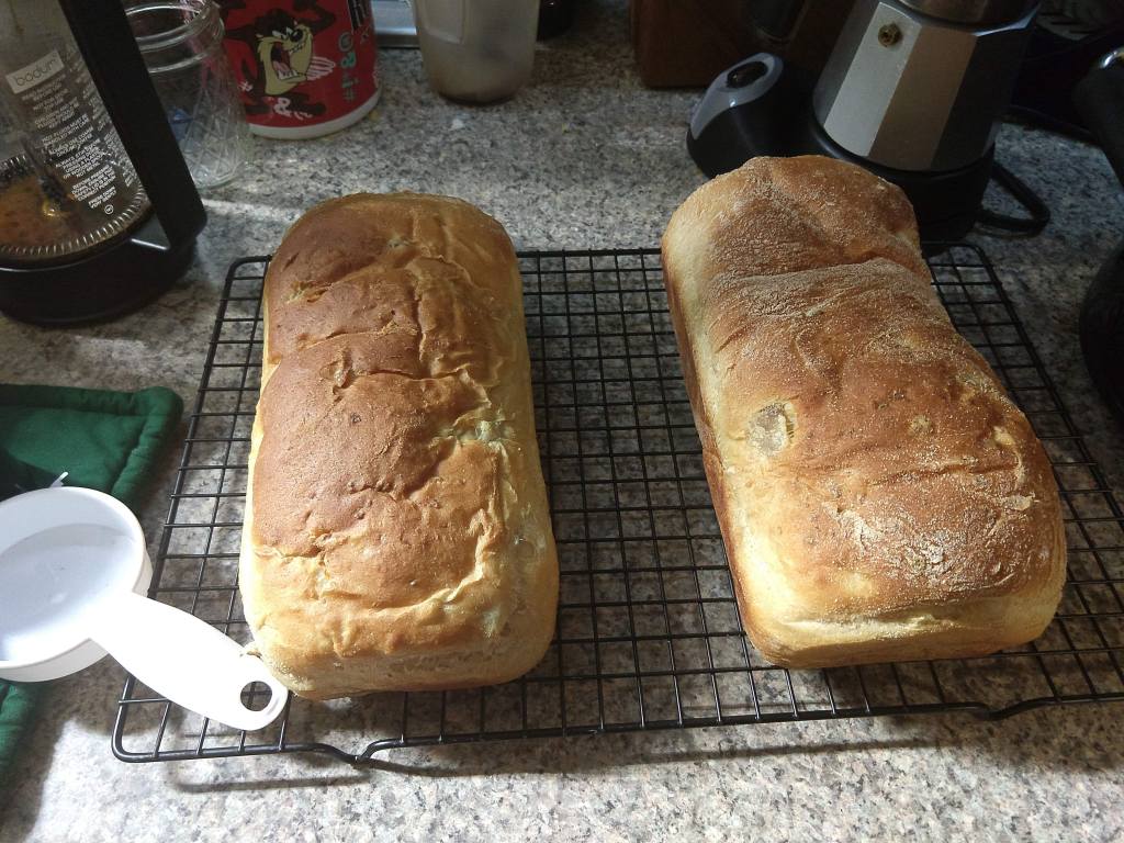 Step one, peel 2 potatoes. Dice the potatoes and cook them. You can boil, bake or do what I did and use the microwave. No, that is not how either of my grandmothers would have done it. It is, however, how I did it. Because I live in the future.While the potatoes are cooling down, mix half a cup of white flour, a pinch of sugar, a scant tablespoon of dry yeast and one and a half cups warm water. Let it get all foamy and bubbly. That takes 10-15 minutes.Smash those potatoes with a quarter cup of butter, 1 tablespoon salt and 1 egg. Set that aside for now.My grandmothers also never used a stand mixer to mix and knead bread. I do it all the time. Pour the foamy yeast mix into the mixer bowl. Add another cup and a half white flour and beat on high for about 5 minutes. You want to develop a lot of gluten before you add any of the other stuff. It will look smooth and stringy when you are done.Add the potato mixture and some more flour. It might take only two more cups, it might take three and a half. Do not add too much extra flour or you will end up with a dry loaf. Mix another 5 minutes, until the dough pulls away from the side of the bowl and forms a single lump. I switched over to whole wheat flour, but you can use all white. Use what your have already, that is the point. I also switched out my mixing paddle for my dough hook. Move the dough to a clean bowl and let it rise until it doubles. It takes a while. Depending on how active your yeast is and how warm your kitchen is, figure 2-4 hours. Punch down the risen dough to deflate it. Divide the dough in half. Roll out each half to get rid of the bigger gas bubbles. You don’t want a big hole in your toast, do you? Shape your loaves as desired.I went with classic bread pan shaped loaves. Let the loaves rise for another hour or so, until they fill out the pans and look cute and chubby. It might take a little longer if the kitchen is cooler.See what I mean? Cute and chubby and ready for a 375F oven for 25-35 minutes.One for the countertop, one for the freezer (so it will not go stale before we enjoy it). Or maybe the extra one will go to a friend. Just make sure the loaves are completely cool before you wrap and store them. Otherwise, moisture will condense on the crust and you will have moldy bread. Yuck. This is great bread. It is soft and delicious. Definitely sandwich worthy. I might add less salt next time. There will be a ‘next time’.