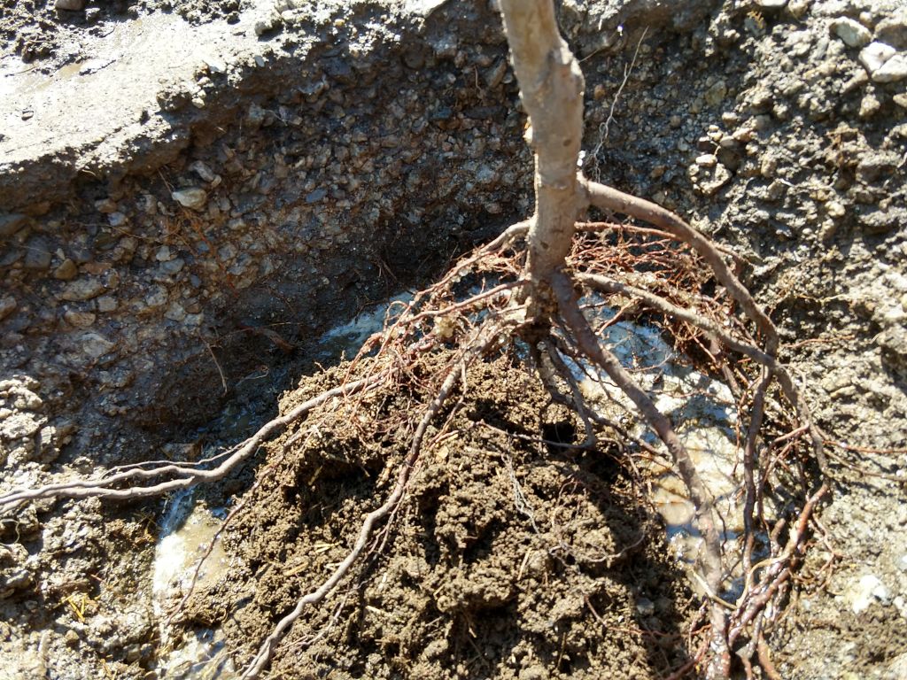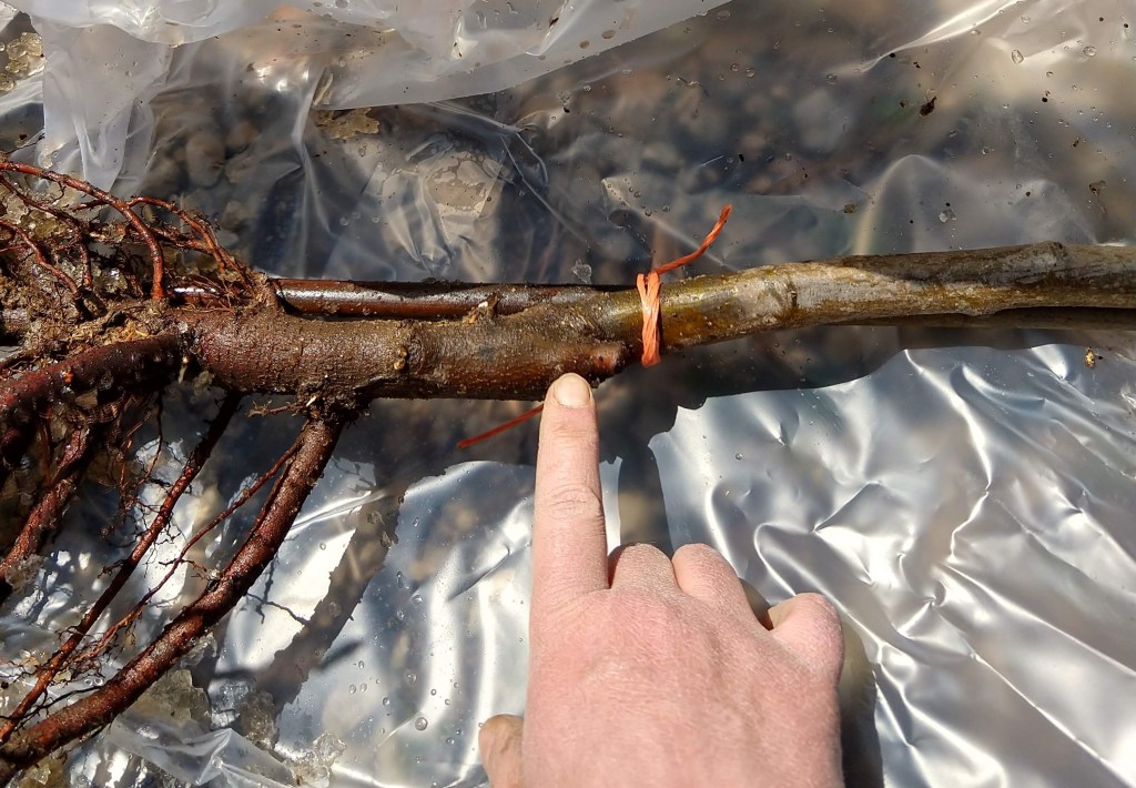 How big a hole should one dig for a tree? The only way to tell is to look at the tree. That little knob I am pointing at in the photo is the point where the root stock was grafted to the main trunk. The knob should be 2-3 inches above the soil. Also, the root mass should be a few inches from the sides of the hole all the way around. Some resources I looked at recommend the hole be twice the diameter of the roots.