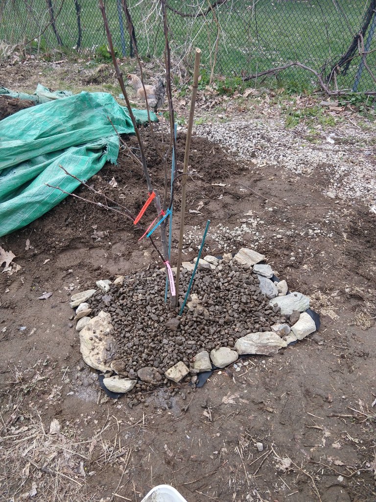 I decided that the best place for my pear tree is right next to my loam pile. (Yes, I am still using loam from the massive pile we had delivered in 2017). This location is protected from gusty winds by a fence, but is far enough from the driveway that we will not dump snow on it in the winter. The area has been covered with gravel as long as we have owned our house, so weeds will not be a problem and the sandy substrate will drain well. Most of all, this area is nice and sunny. Totally worth digging through an inch or three of gravel for all those positive attributes. I excavated a hole of the proper dimensions, and sifted the gravel from the dirt. I used the dirt to fill in some holes the chickens dug in the back, which will hopefully prevent me from twisting an ankle later. I reserved the gravel.