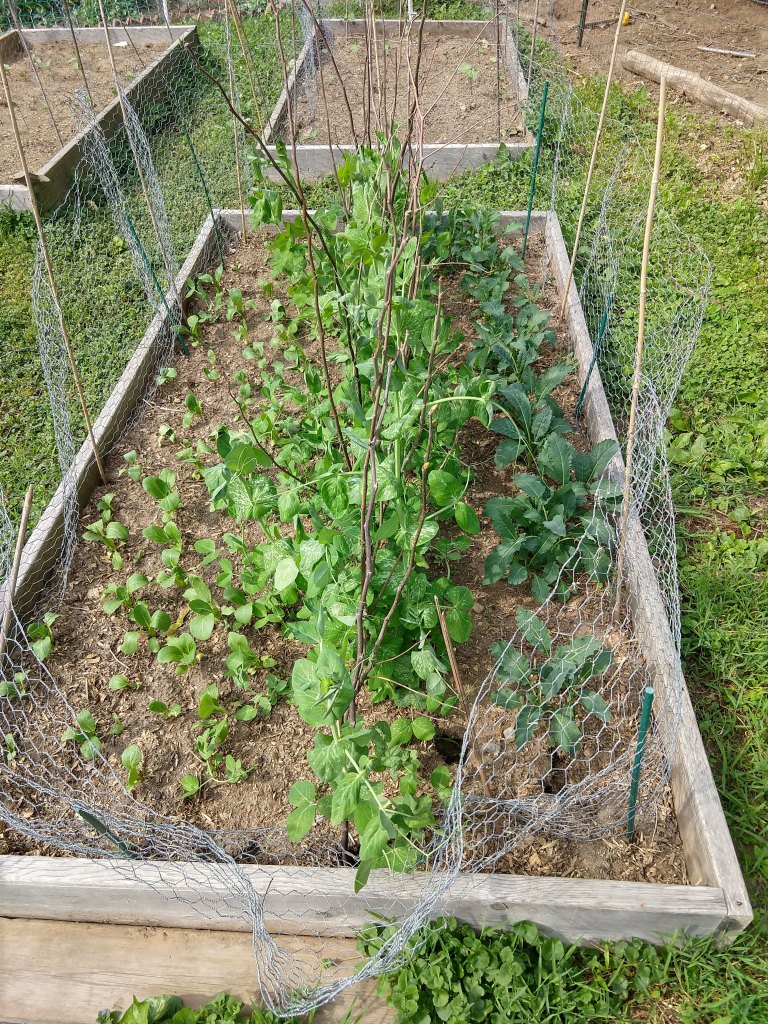 Raised bed 1: That’s bok choy on the left, snow peas in the middle and kale on the right. How happy do they all look? I really expected to just feed the kale to the chickens, but I am thinking I might try to get over my dislike of kale. I am taking any and all suggestions for non-gross kale recipes. Please respond in the comments section.