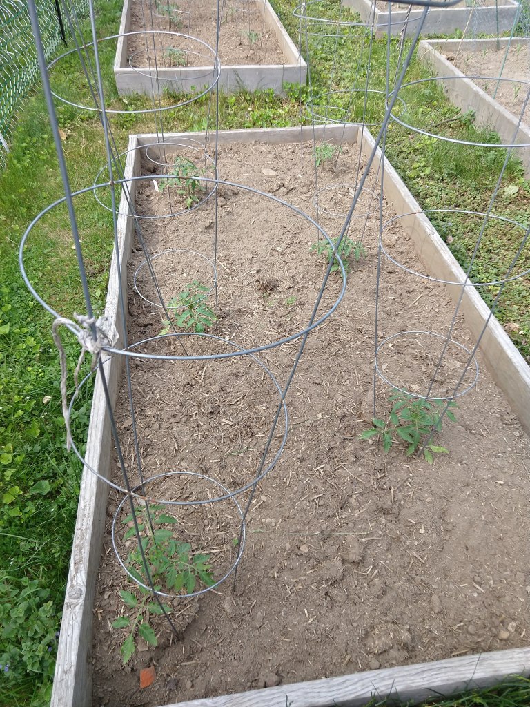 Raised beds 4&5: Tomatoes and carrots. Again, by the time the tomatoes are really big the early carrots will be harvested. As you can see by the large divots in the dirt, however, the chickens took dust baths that squashed my carrot sprouts. I replanted the carrots. Late carrots will be planted in Raised bed 1 after the greens currently there are harvested. Oh yes, I have thought this through.