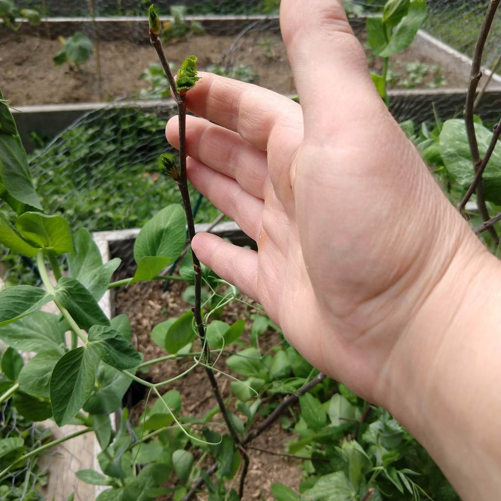 Now here is a big surprise. Remember how I cut down all those weedy, unwanted saplings in February? Remember how I used the branches to make a fence for my snow peas in April? Well, now this is happening: