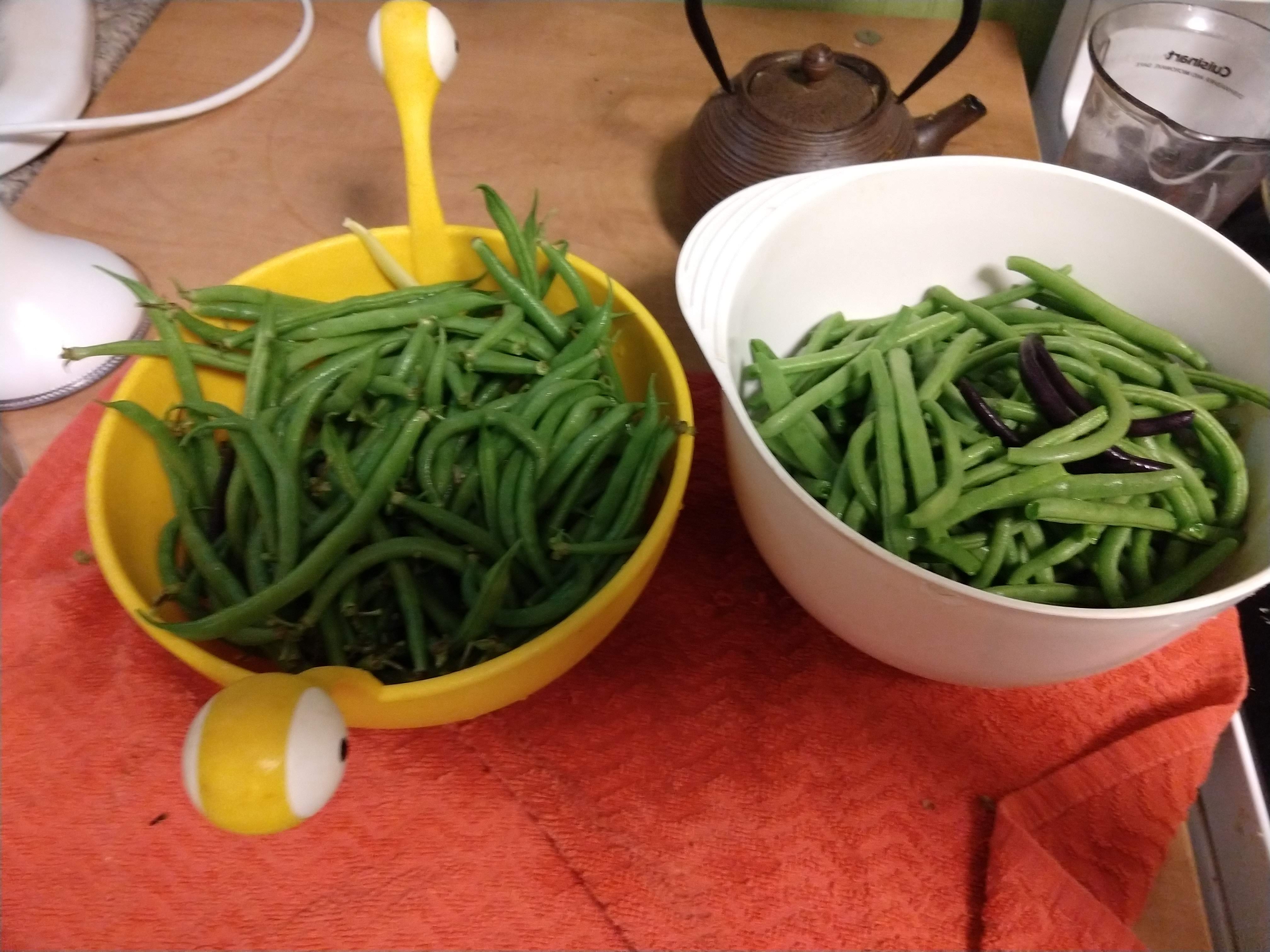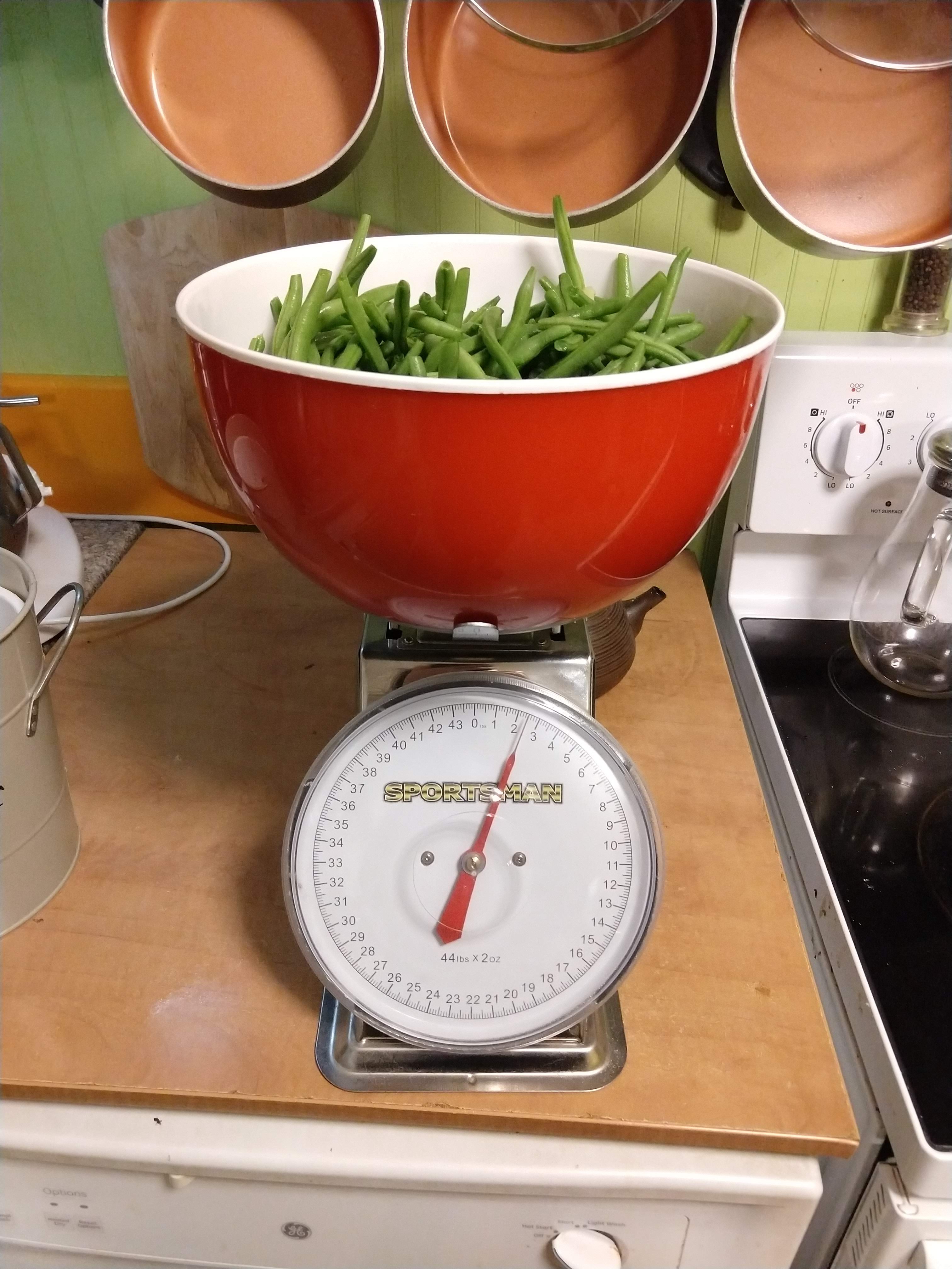 First, the beans must be picked. The variety is “Provider”, I think it is an apt name, indeed!After a good wash, I snapped the ends off the beans. The beans were so snappy and tender I would almost call them brittle. Is that from the cool weather? I do not know. Just out of curiosity, I put the trimmed beans on the kitchen scale. That is almost two and a half pounds of home grown deliciousness. Next, the beans took a quick boil-Just a minute or two, until the color turned vivid green. This was followed by a thorough chill in ice water to stop the cooking action. This process is known as “blanching”. It will help preserve the quality of the beans in the freezer.After a good blot dry, the beans got bagged and labeled for the freezer. Remember to include the date and the weight.