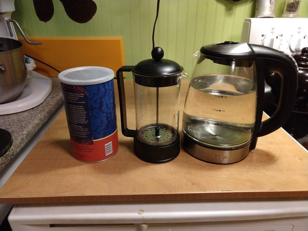 The night before, I gathered all the necessary equipment. I am using a French press coffee maker, since I have one. This will streamline the filtering process. You can use any jar, pitcher, or canister you have, though. As long as it holds about four cups (one litre) of liquid and fits in your refrigerator, it should be fine. At least, that is what they say on the cold brew coffee websites.