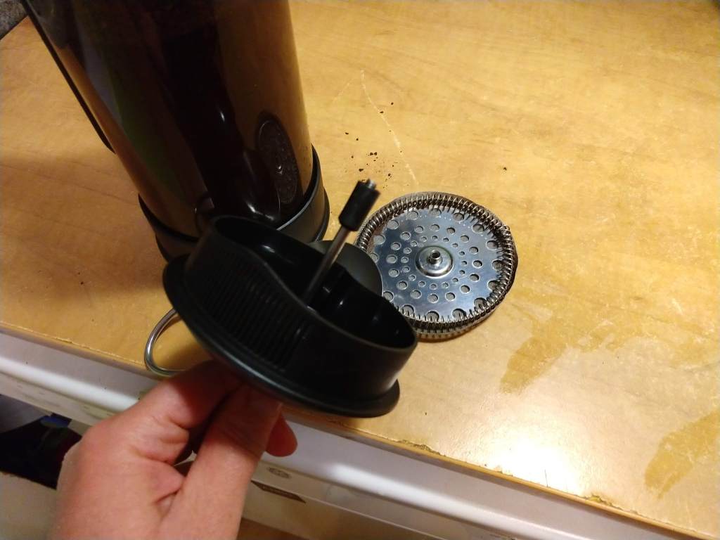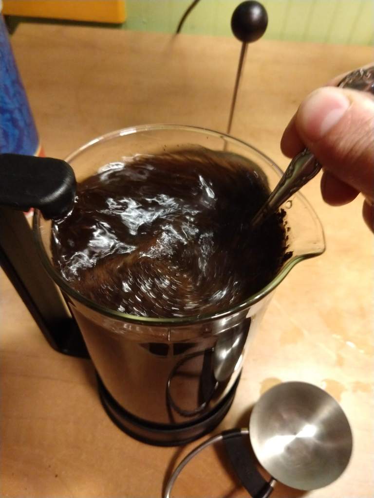 I mixed three-quarters cup of coffee and four cups of water, using a long spoon to make sure all the grounds got wet. The exact ratio of coffee to water varies depending on which recipe you look at, but this seems to be the average recommendation. That is all the work that you have to do. The trickiest part for me was figuring out how to cover the French press. It took me ten seconds to unscrew the filter assembly from the lid. The rest is just a matter of time in the ‘fridge.