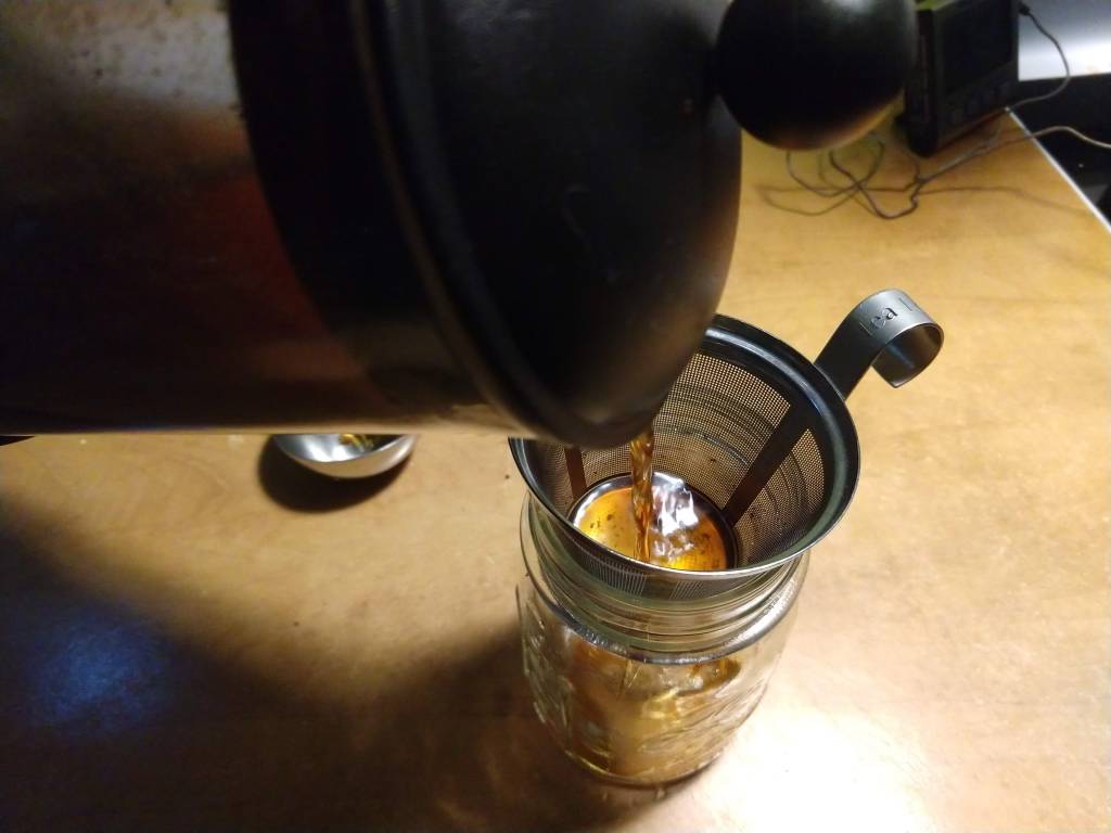 The next morning, I re-assembled the filter assembly on the French press and strained the coffee. If you are using a regular jar or pitcher you can use any fine-mesh strainer, cheese cloth, paper coffee filter, or clean dish towel to remove the coffee grounds. An important thing to remember is that cold brew formulas generally produce an extra strong brew to account for adding ice cubes. I like my coffee strong, so I poured a cup full-strength. (I poured through a tea filter to make sure I got all the grit out. ) The extra went into a jar to meet future caffeine needs.