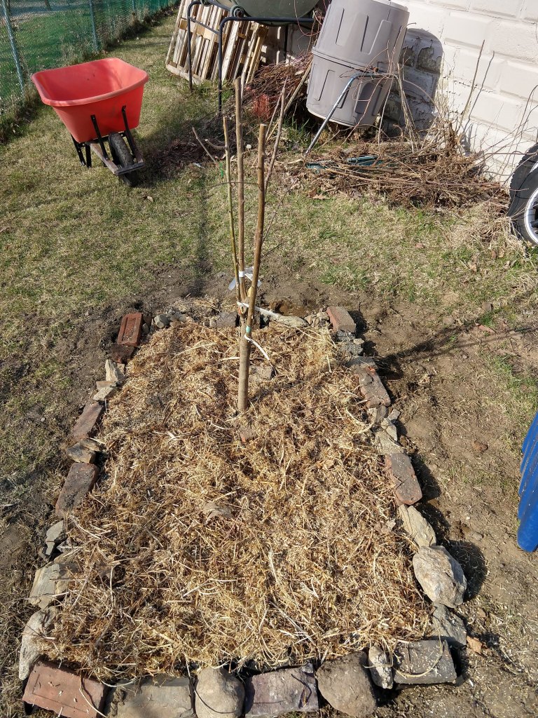 More positive news-I arrived home from work a few weeks ago to find my fruit salad tree had arrived! I ordered it last year, but it was back-ordered from the nursery. For those of you who are unfamiliar with the concept, a fruit salad tree has peach, apricot, plum, and nectarine all grafted on to a single (in this case dwarf) root stock. Those fruits are all so closely related, it works. I am excited for this addition to our Foodscape. (Yeah, that’s what they are calling it these days.) Even with the 3ish inches of snow we had after I planted it, it is still looking good.