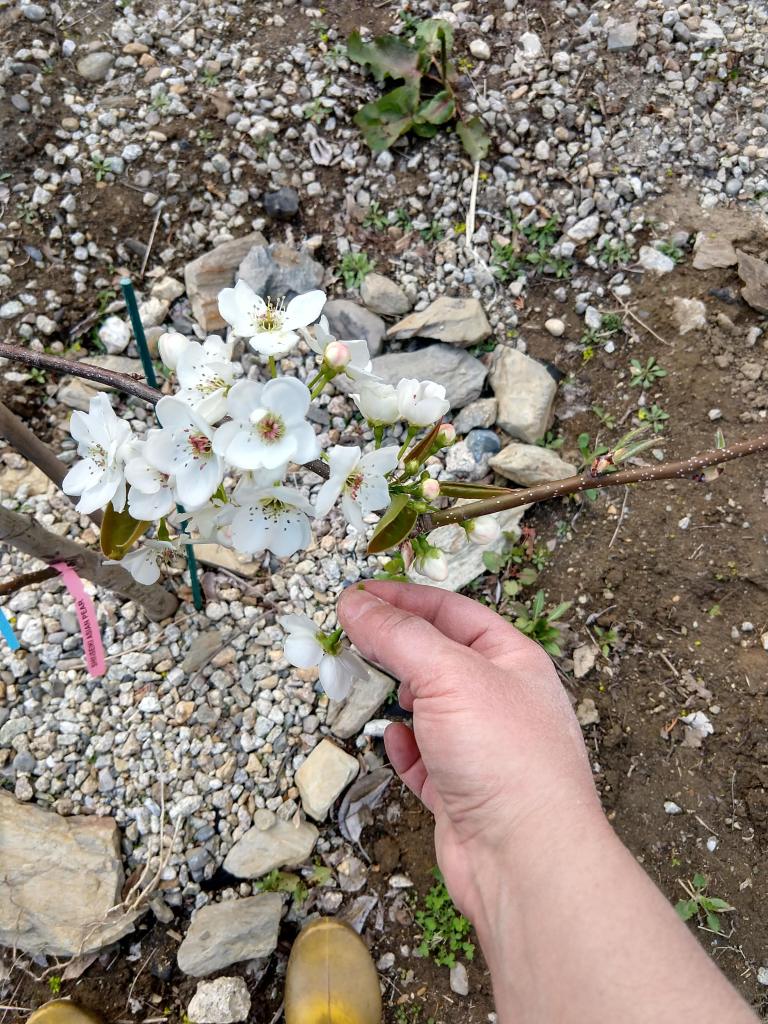 Look at all those blooms! Now look at how I removed them all, leaving only the leaves. Yes, it seems extreme. Yes, I feel like a horrible monster. However, look at how thin the branches still are. They cannot support fruit just yet. The tree needs to focus on producing roots for another few years before I let it put energy into fruit. Fruit trees are all about the long game.