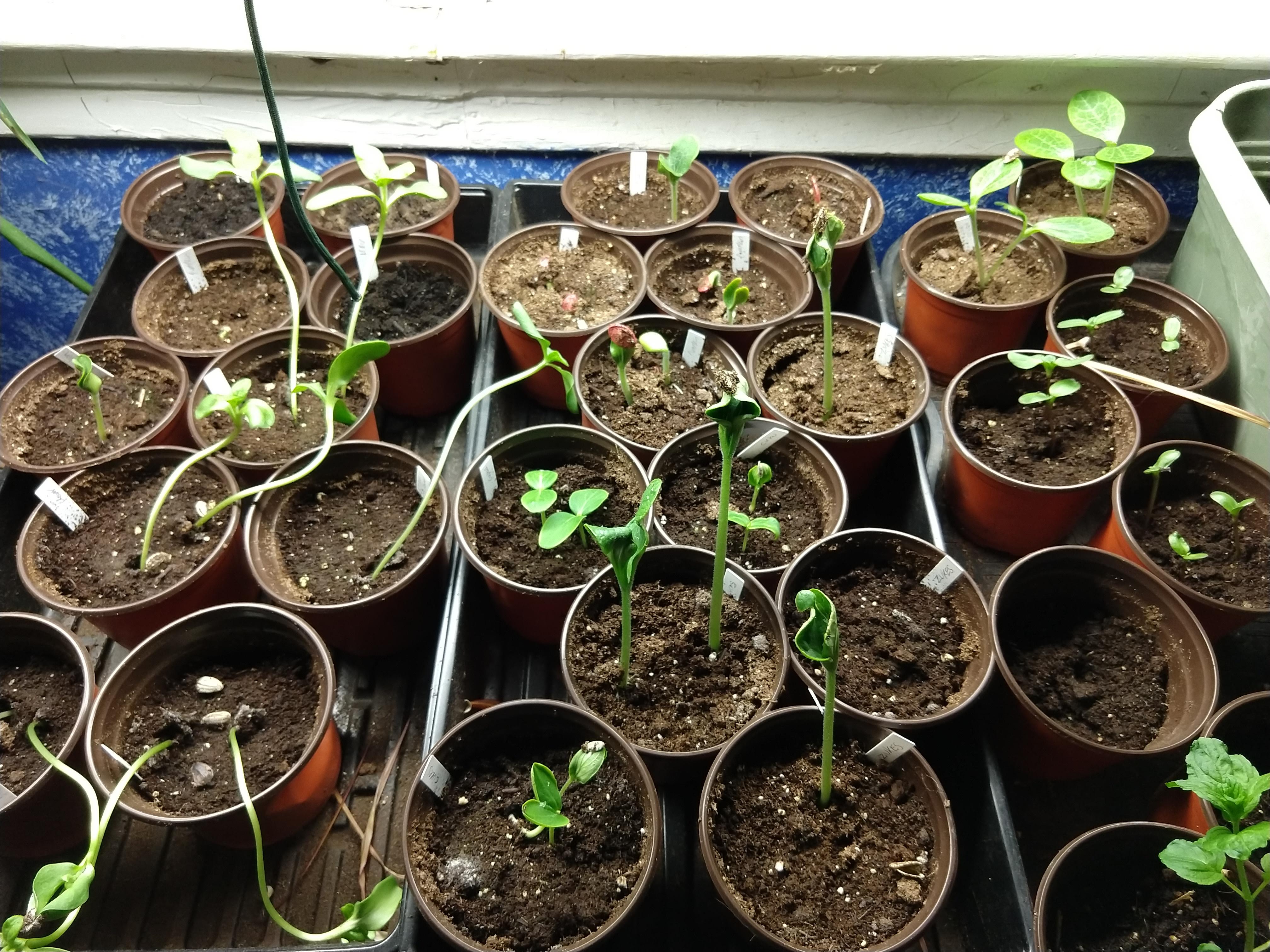 All the other seedlings are looking good, too. Those floppy things are mammoth sunflowers. I will ask Mr. Food It Yourself to prop them up with bamboo skewers. The rest are zucchini, yellow summer squash, pumpkins, and cucumbers. It fills me with hope to see so much growth!