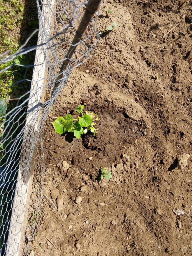 The four zucchini and yellow summer squash plants fit nicely between the front yard tomatoes. If the plants do thrive and produce we will have plenty of squash for ourselves, our neighbors, and our local food pantry. (Yes, we already checked and our local food pantry is able to accept fresh produce.) I only had one extra cucumber, so that went in the raised bed where the other cucumbers are growing. What is the harm in one more? None that I can see.