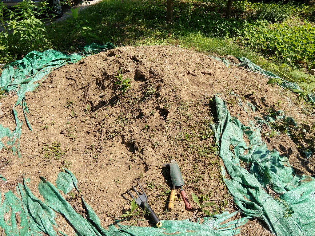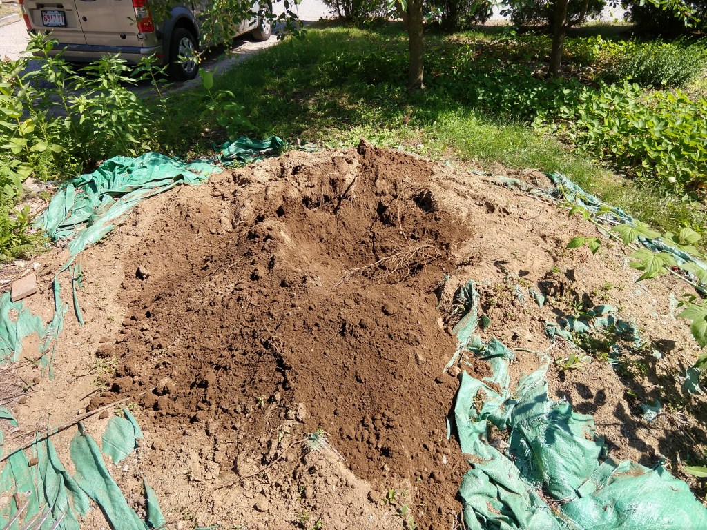This left the pumpkins, of which there were 6, two each in three pots. Where could I plant six vining, heavy feeding, sun-loving pumpkins? There was only one location- the loam pile. The remnants of the load of loam/compost mix we purchased a few years ago sits in a sunny location in the front yard. The soil is still high quality. By planting into the top of the mound, the pumpkin vines will have room to run. Here is how it all worked out: