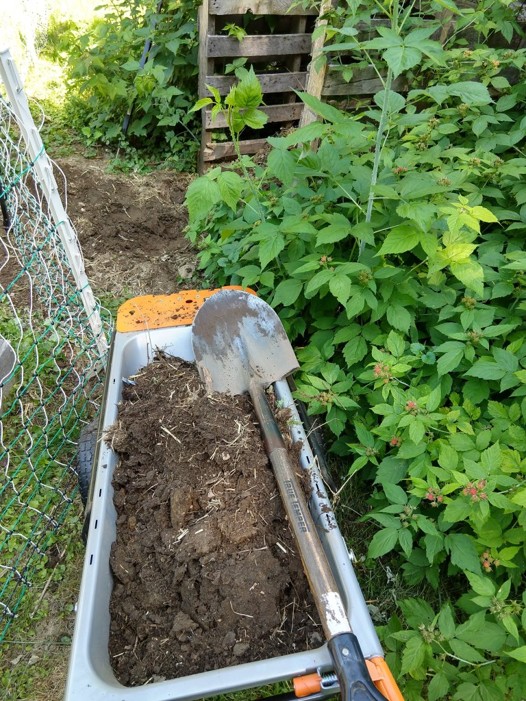 First, I made a well in the loam crater. Then, I added fresh chicken run sweepings (aka chicken poop) and compost, which I mixed into the loam. (I would like to take a moment to publicly thank Mr. Food It Yourself for the snazzy wheel barrow he bought me for my birthday.) Mixing the high nutrient stuff thoroughly with the loam is an important step. Fresh compost, especially the very-high-nitrogen coop sweepings, can damage plant roots. It also makes up for skipping the gym.