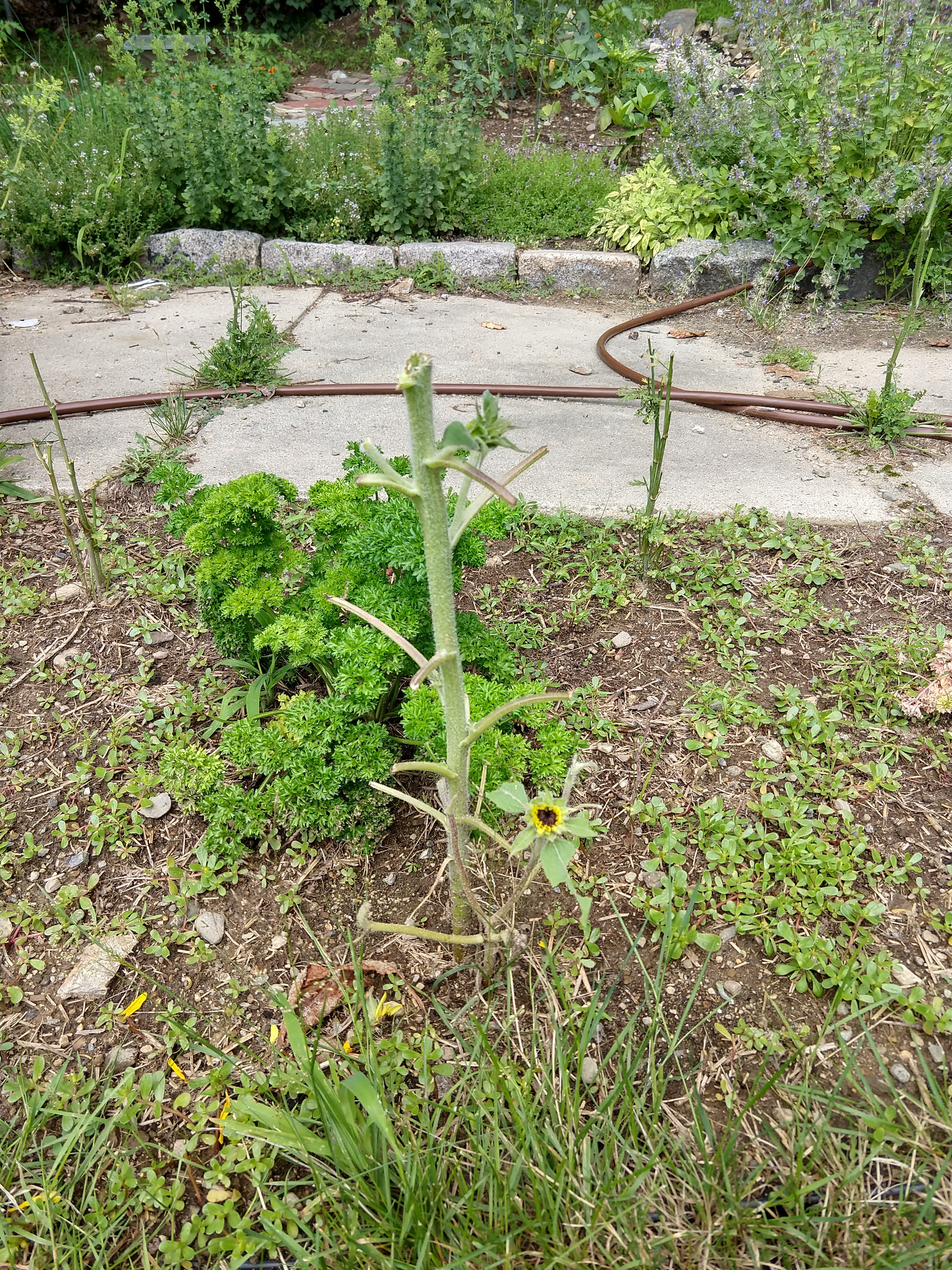 Let me explain the image above. That is one very rough textured sunflower and several pungent cilantro plants, completely devoid of leaves. Adjacent, note the mound of delicately flavored parsley which has nary a nibble. Who the heck does that? I have my suspicions.
