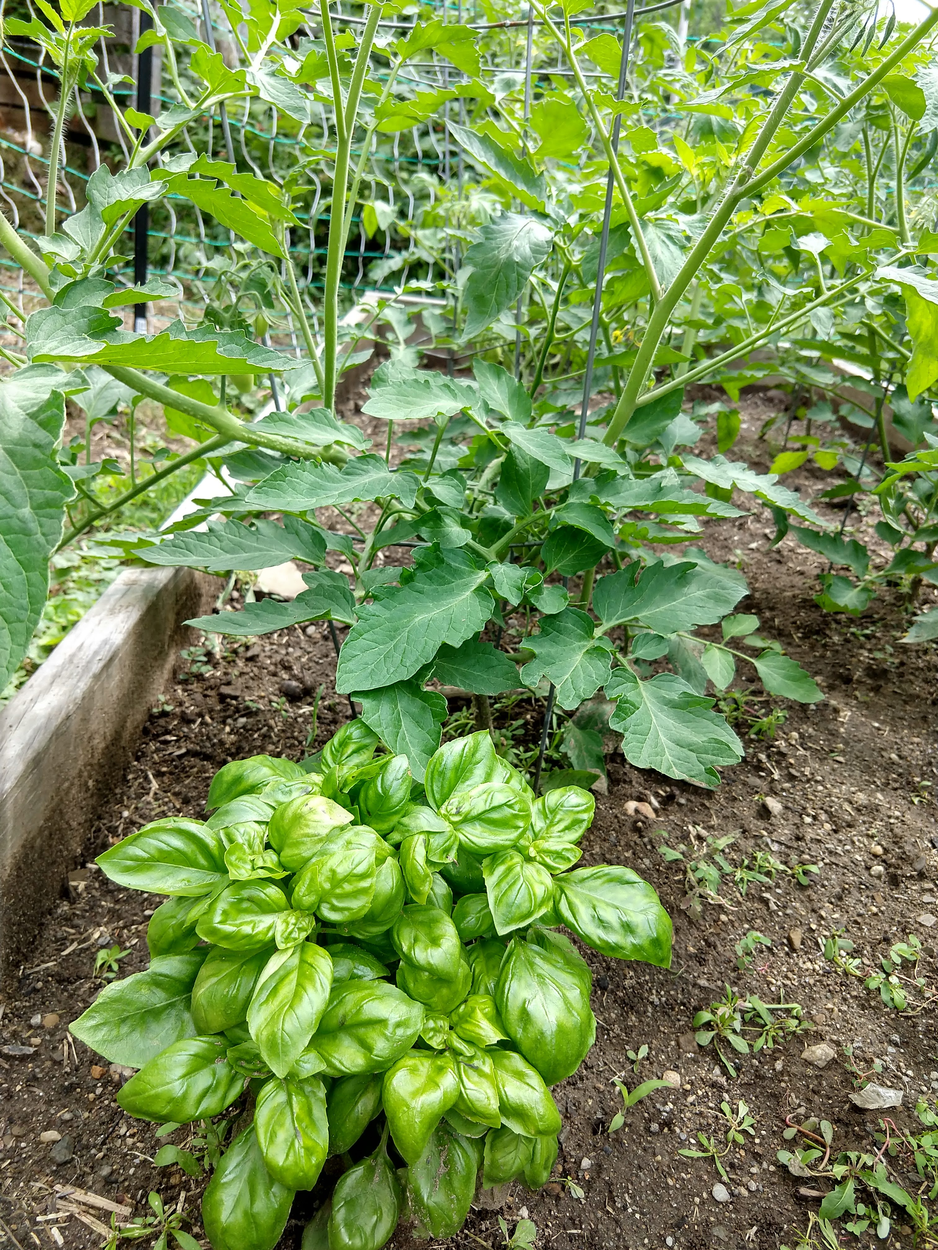 Who loves heat and humidity even more than insect pests? You are correct- both the front and back yard tomatoes are thriving in the heat. They do seem to be pining a bit for the sunshine lately. Still, all plants are growing, blooming, and starting to fruit. The basil is also quite content, and I am cautiously planning some large scale sauce production for later in the season.