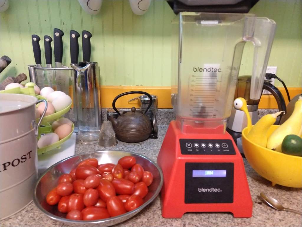 Start with a few tomatoes in the blender (or one tomato if yours are normal sized; mine seem to be on the small side this year). Add just enough water to get the blender to work and pulse until the tomatoes are broken up. Once they are ground up, add the rest of the tomatoes and the garlic if you are using it. Give it a good spin on high speed.
