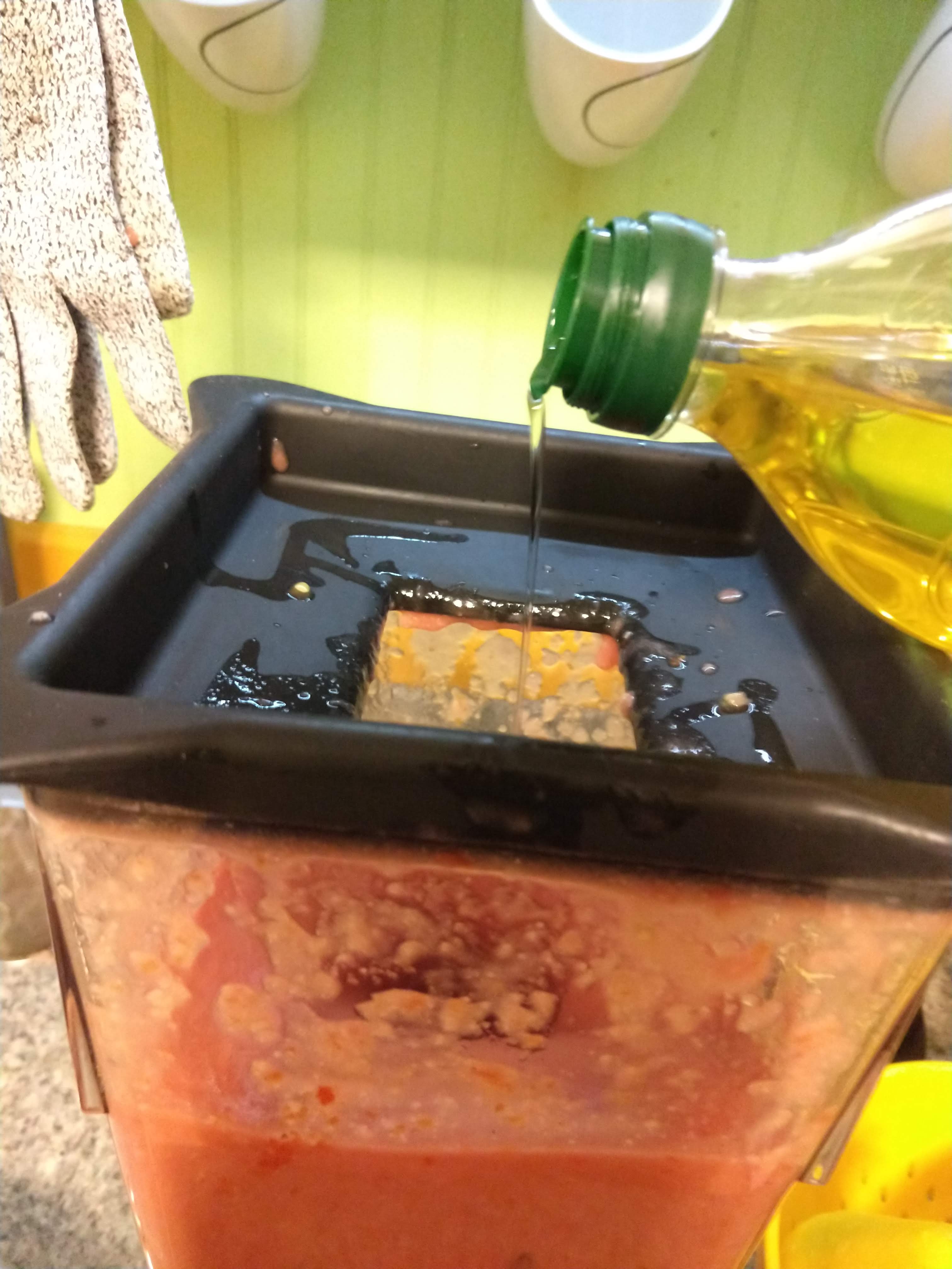 Start the blender again. While the bread is integrating into the mix, add a drizzle of olive oil.