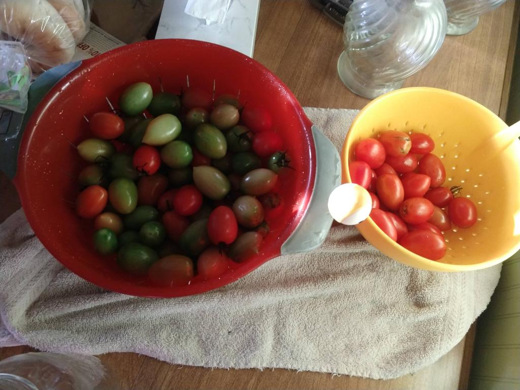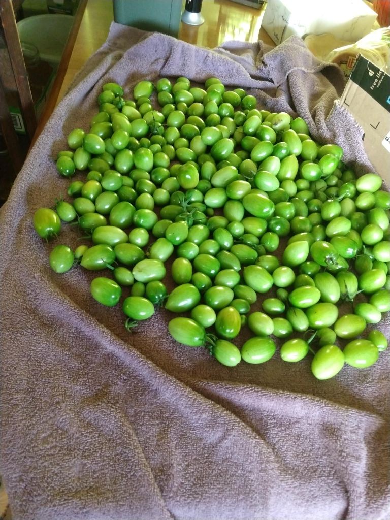 Summer is officially over in the northern hemisphere, and autumn is making itself comfortable. There is no longer enough daylight to ripen my tomatoes, so I have taken the plants down and salvaged as much fruit as I could. I was left with three piles. The ripe tomatoes will go into the freezer. The getting-ripe tomatoes will spend a few days in a paper bag with an apple. When they are ripe, they will join the other ripe tomatoes in the freezer until I have the chance to make sauce. What shall I do with the very hard and green ones, though?