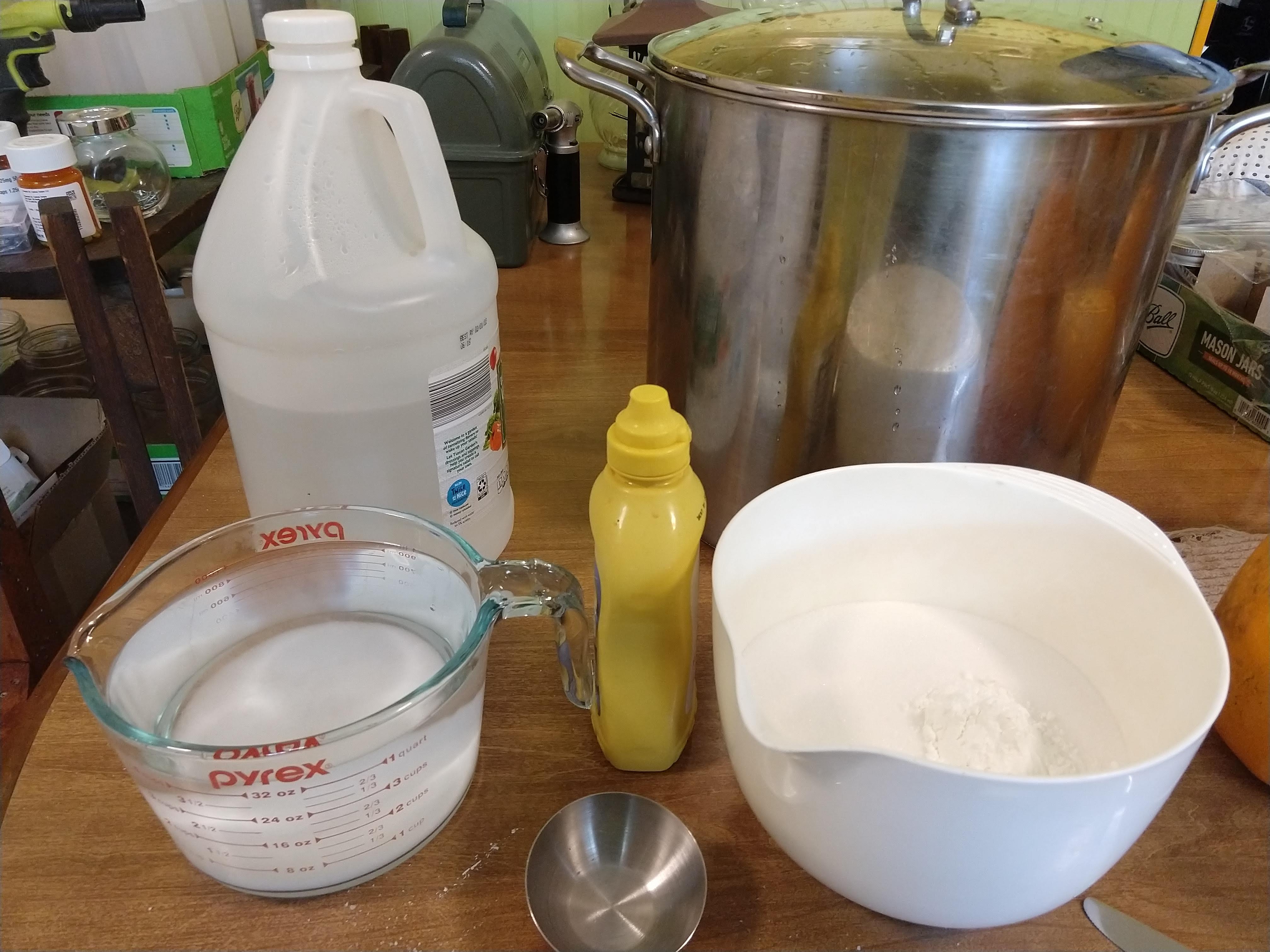 For the cooking phase of the operation, my top tip is to have every ingredient and measuring device ready to go before you turn on the stove. Here I have the water with the salt dissolving in it, the sugar and starch measured out and mixed together, and the vinegar and mustard ready to be measured once the water has been emptied from the big measuring cup. Only with all these things in place did I turn on the stove. You do not want to be digging through a kitchen drawer looking for a one-third cup measure while your relish is scorching on the bottom of the pot.