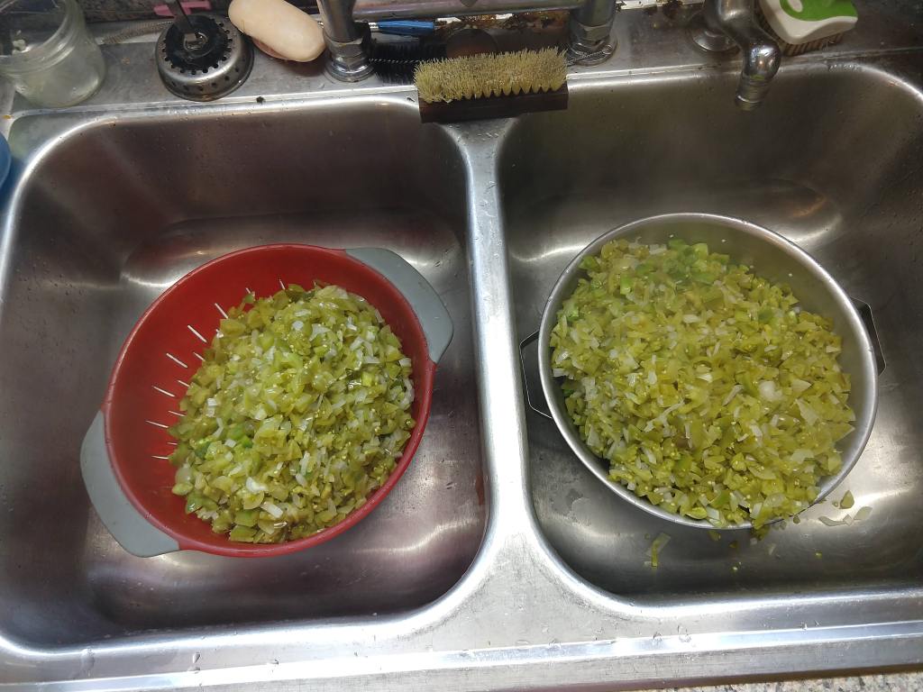 One final tip, this one relates to the processing phase. I can scald 18 jars at once in my canner, but I cannot process that many. So, I pulled out nine, while the rest stayed in the boiling water. I filled and capped the first nine jars, then removed the second nine. The first nine processed while I filled and capped the rest. All the jars are hot during filling and have plenty of room during processing. I will have to wait until tomorrow to be sure, but as of right now, all 18 jars of relish have sealed.