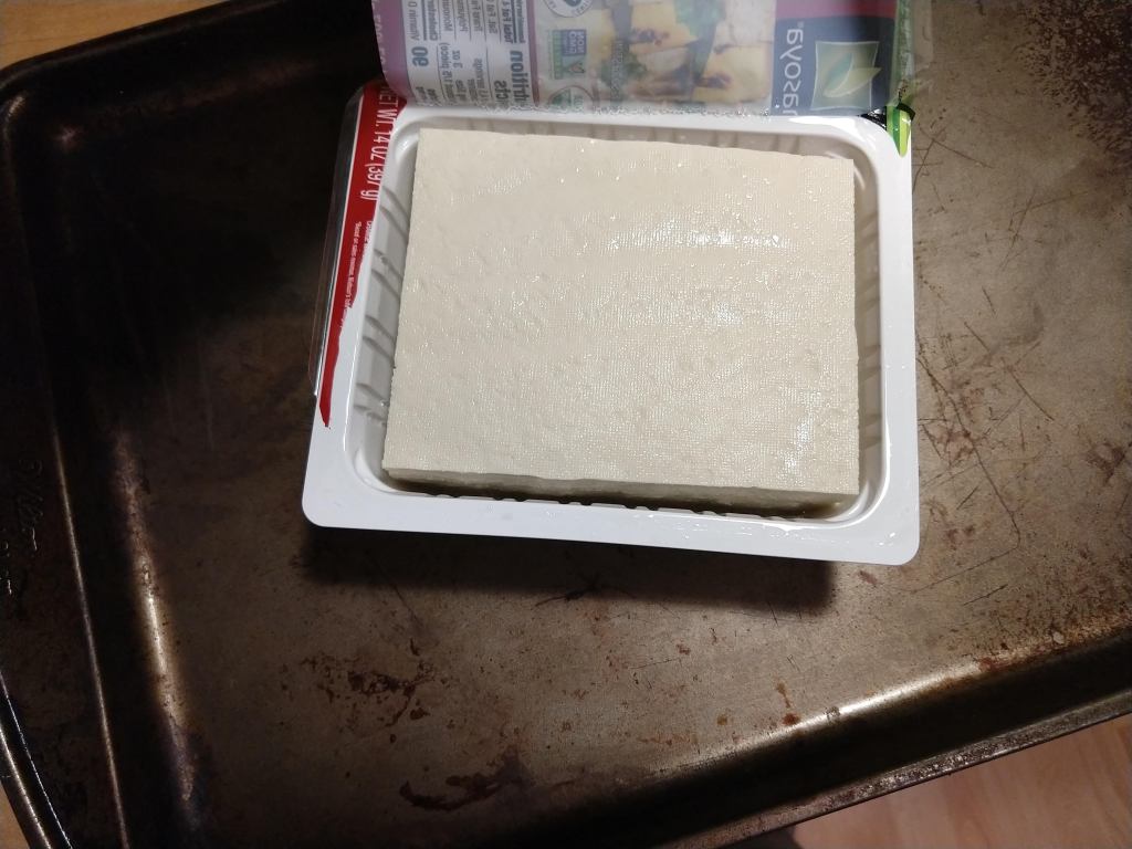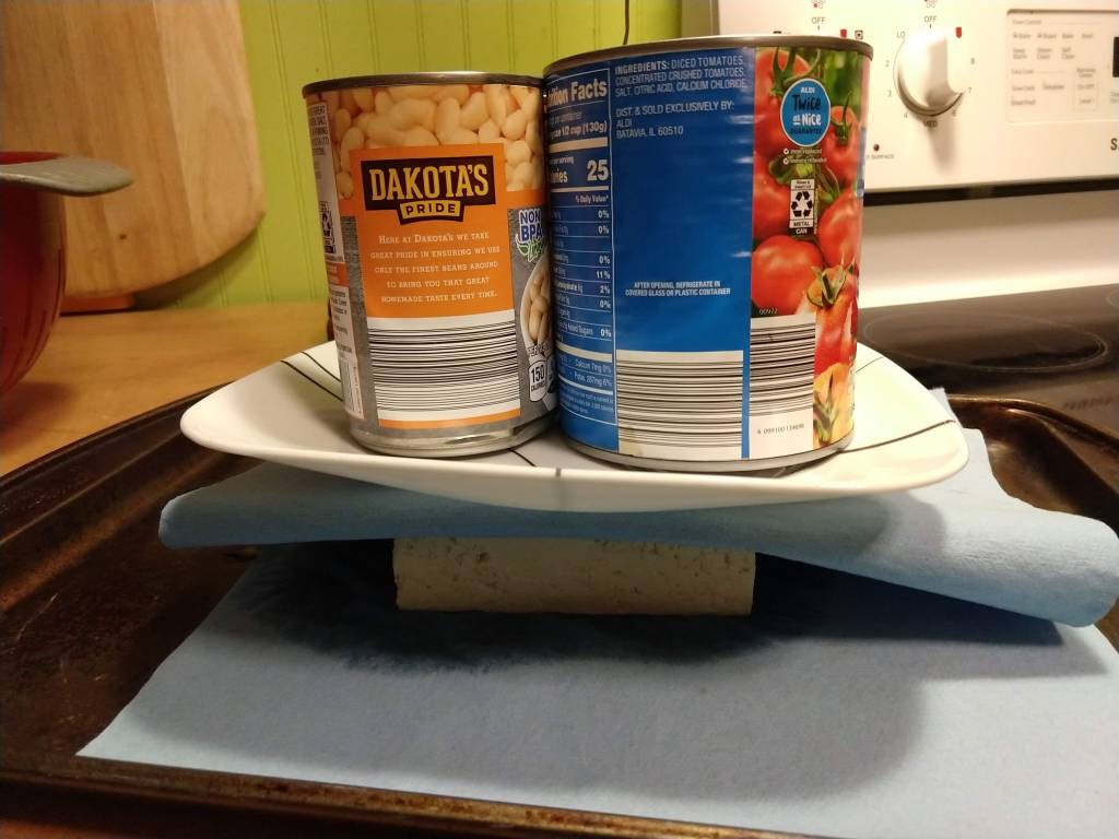 I recommend starting with extra firm tofu, my go-to tofu choice for stir-fry dishes. First, drain the water from the block of tofu (if your tofu was packed in water). Next, remove more water from the bean curd by pressing it under weight. A plate and a few canned goods are handy here, as illustrated. I wrap the tofu in paper towels during this step. If you do not use the paper towels, make sure the tofu is on a dish with a lip to contain the water that is pressed out.. Also, make sure the canned goods are balanced and stable before you walk away. Just trust me on this.