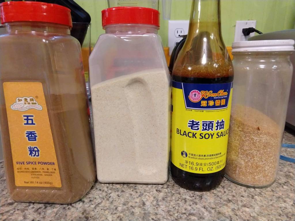 While that happens, mix up a marinade. I used about one quarter cup of black soy sauce and a fat pinch each of garlic powder, onion powder, and five spice powder. Five spice is a blend of cinnamon, ginger, star anise, fennel seed, and clove that really takes your stir-fry game to the next level. You can find it easily on-line, but I recommend a visit to your local Asian market if you are looking to purchase some.